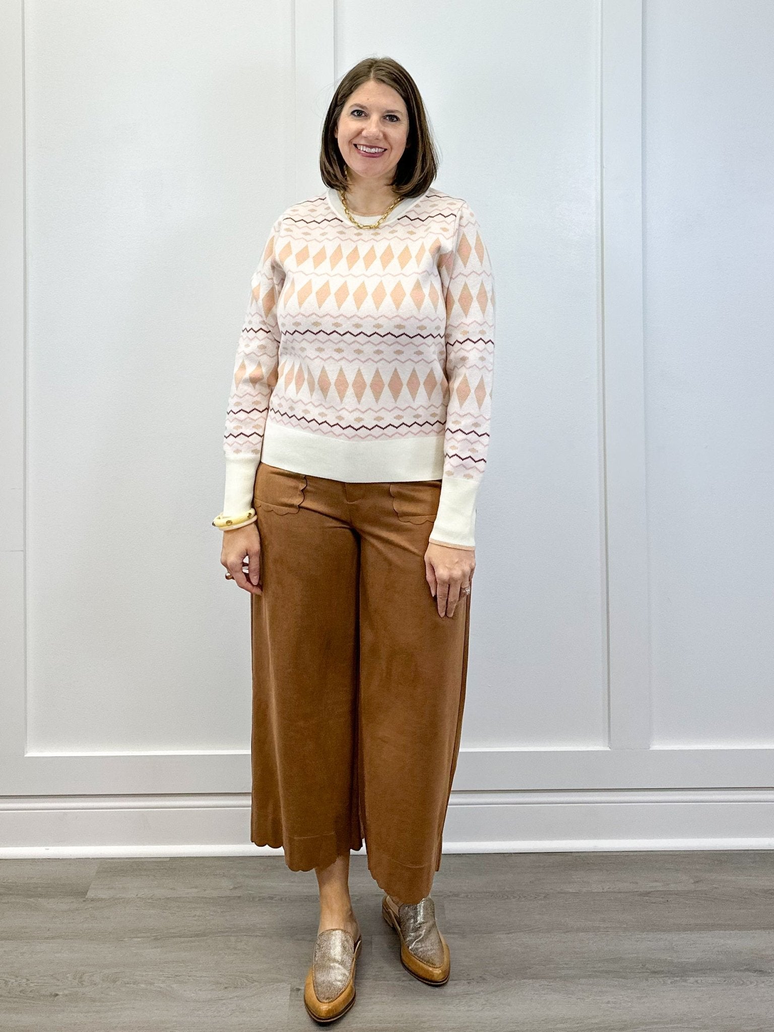 Soft, serene, and subtly striking — the Diamond Drift Sweater blends cozy comfort with effortless style. Featuring a delicate diamond pattern in warm, neutral tones, this knit adds a touch of sophistication to any casual look. Pair it with denim for laid-back weekends or dress it up with tailored pants for a polished finish.