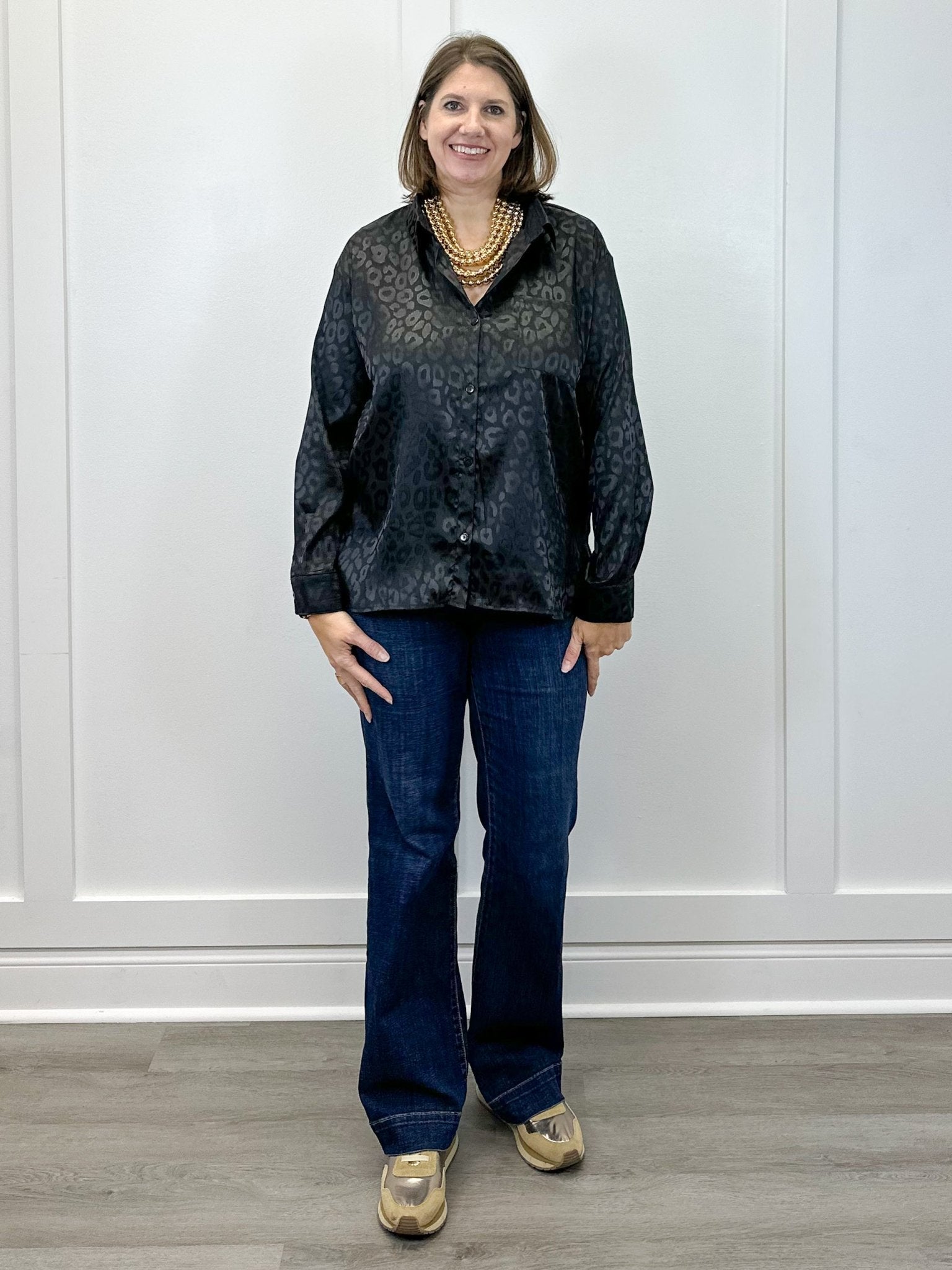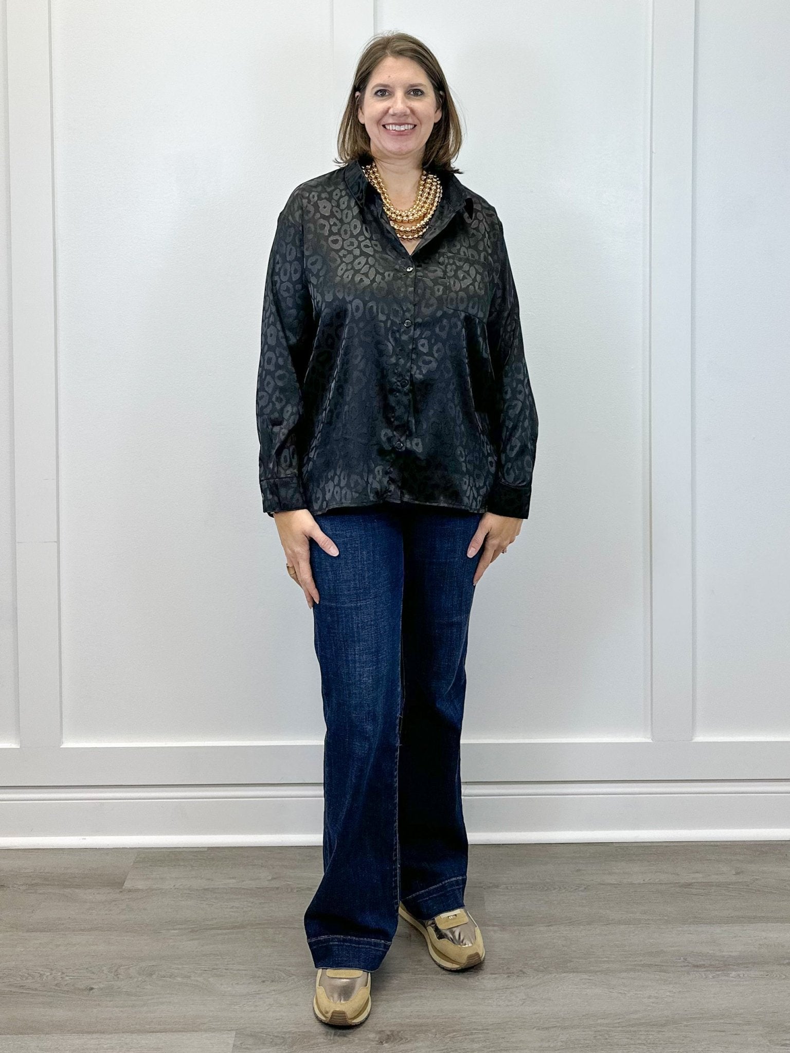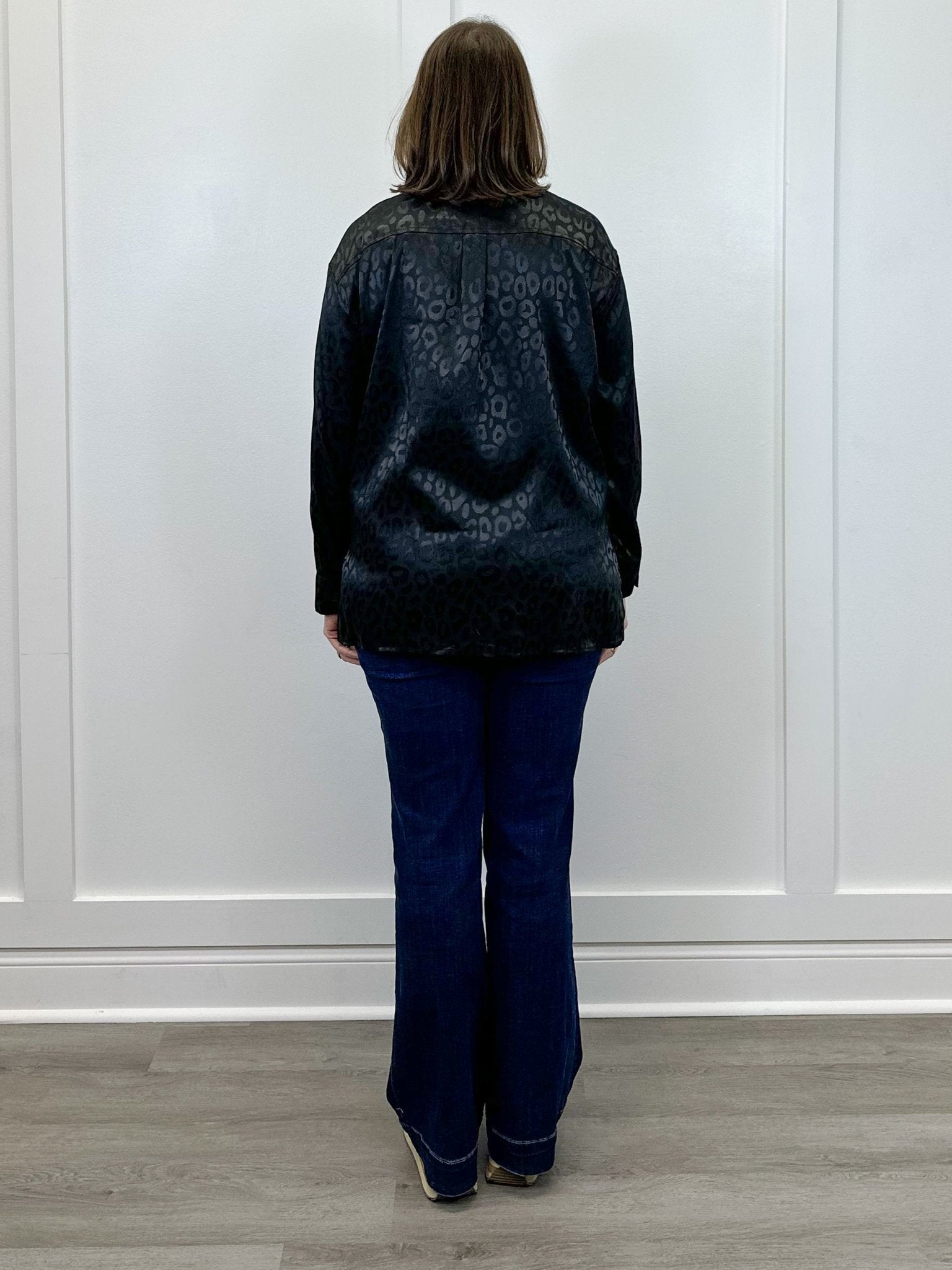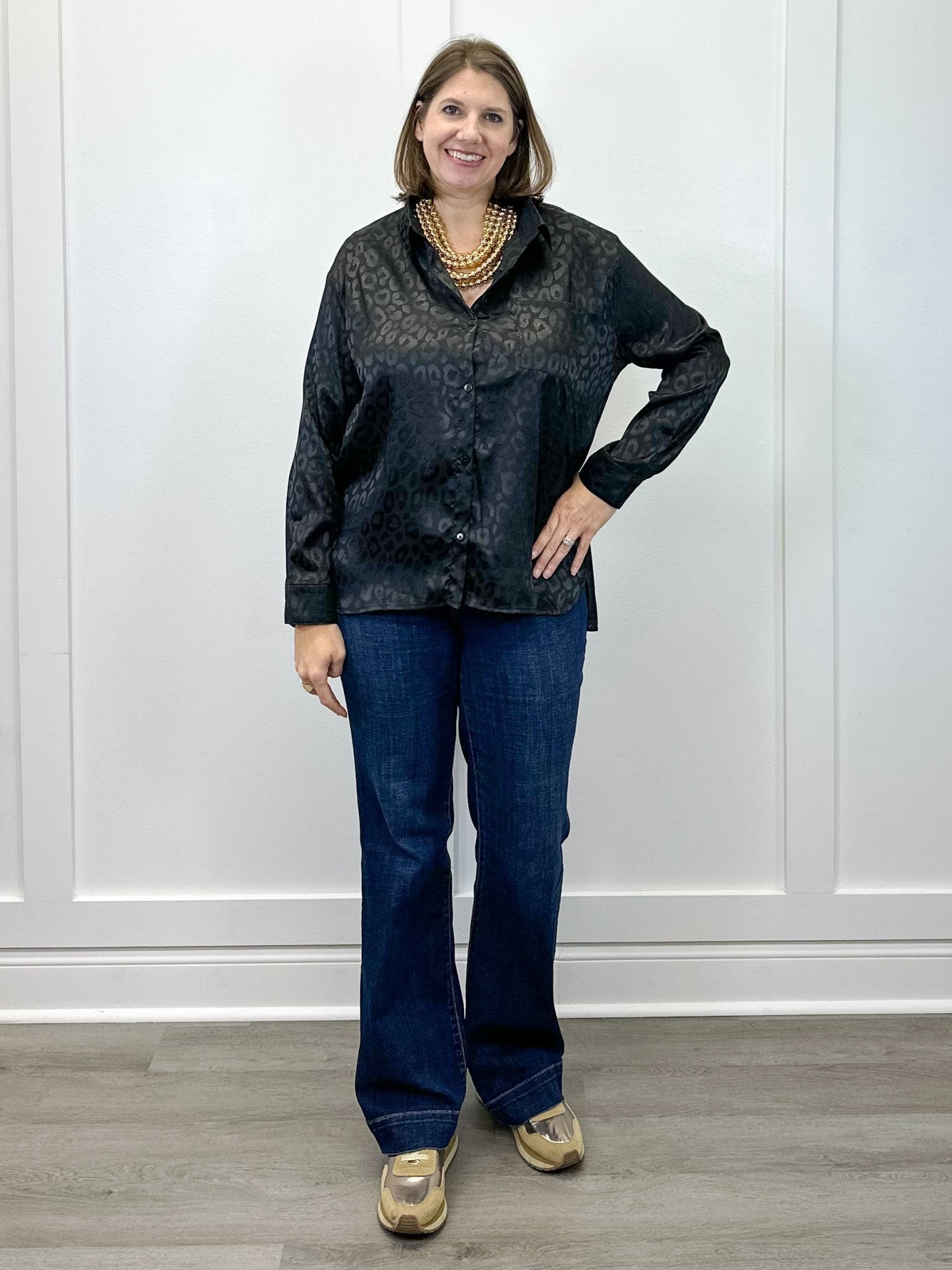 Meet your new statement essential—the perfect blend of sleek, bold, and effortlessly cool. This satin-finish button-down features a subtle tonal leopard pattern that catches the light just right, giving you an elevated edge without ever trying too hard. Whether you're pairing it with denim for a night out or dressing it up for the office, this top brings instant confidence and modern chic to any outfit. It’s the kind of piece you slip on and instantly feel amazing in.