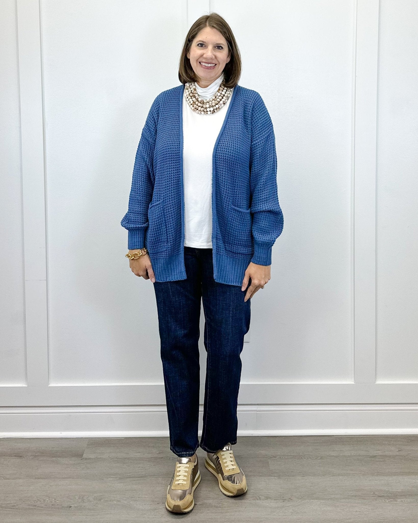 Cozy meets chic in the Parker Waffle Knit Cardigan. Designed in a beautiful dusty blue hue, this midweight cardigan is crafted in a textured waffle knit that’s perfect for layering. With an open-front design, cuffed sleeves, and a relaxed silhouette, it’s the versatile piece you’ll reach for on cool mornings, casual days, or cozy evenings in.