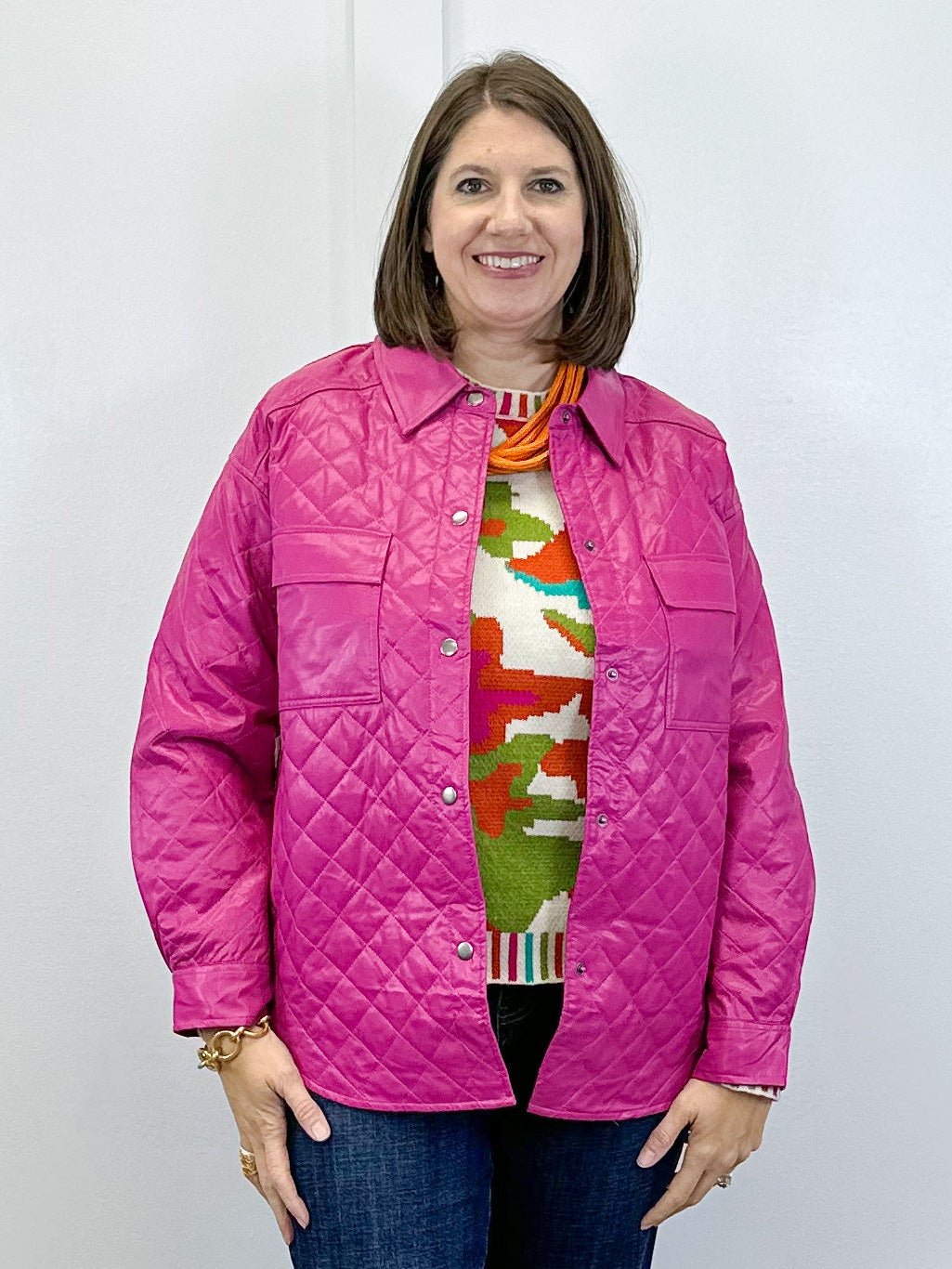 The Rebel Rose Quilted Jacket brings a touch of edge to classic outerwear. Crafted from luxe faux leather with an intricate quilted design, this statement layer balances softness and structure for a look that’s both rebellious and refined. Finished with snap buttons and functional chest pockets, it’s a must-have piece that exudes confidence in every detail.