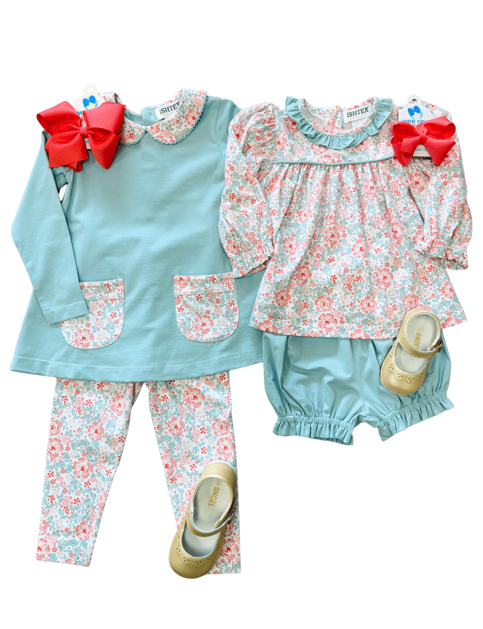 Delightfully charming, the Shallot Rose Tunic Set is designed with a touch of elegance and everyday comfort in mind. This two-piece outfit features a soft blue tunic top accented with a floral Peter Pan collar and coordinating floral-trimmed pockets for a sweet, timeless look. Paired with matching floral leggings, this set is as practical as it is picture-perfect—ideal for school days, playdates, and family gatherings.