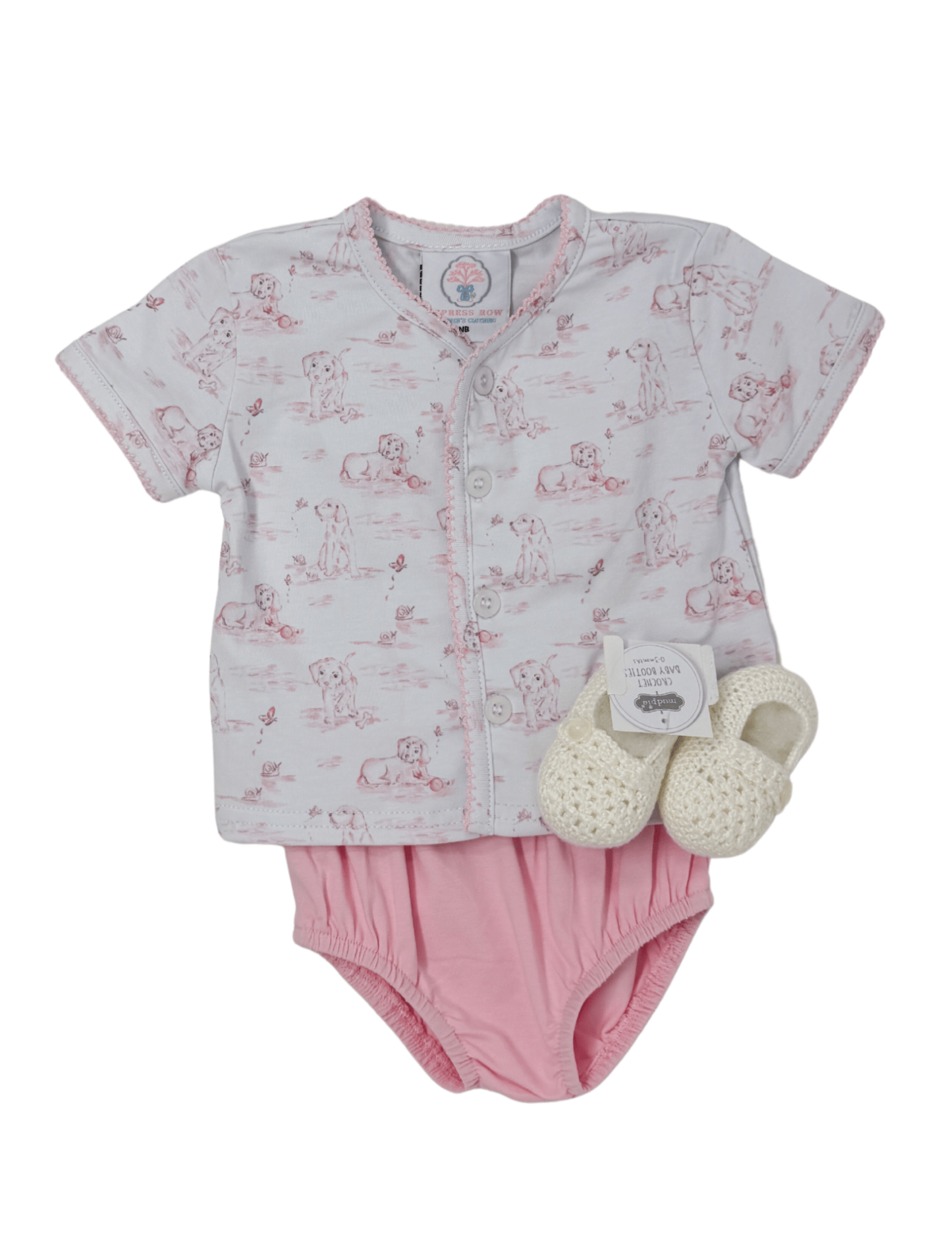 Sweet, soft, and full of storybook charm, the Snips & Snails Little Layette is made for those earliest, most tender days. The delicate puppy print feels timeless and gentle, while the cozy short-sleeve top and matching bloomer create an effortlessly precious look. Designed with comfort in mind and cuteness guaranteed, this set is perfect for cuddles, first photos, and all the little moments you’ll want to remember forever.