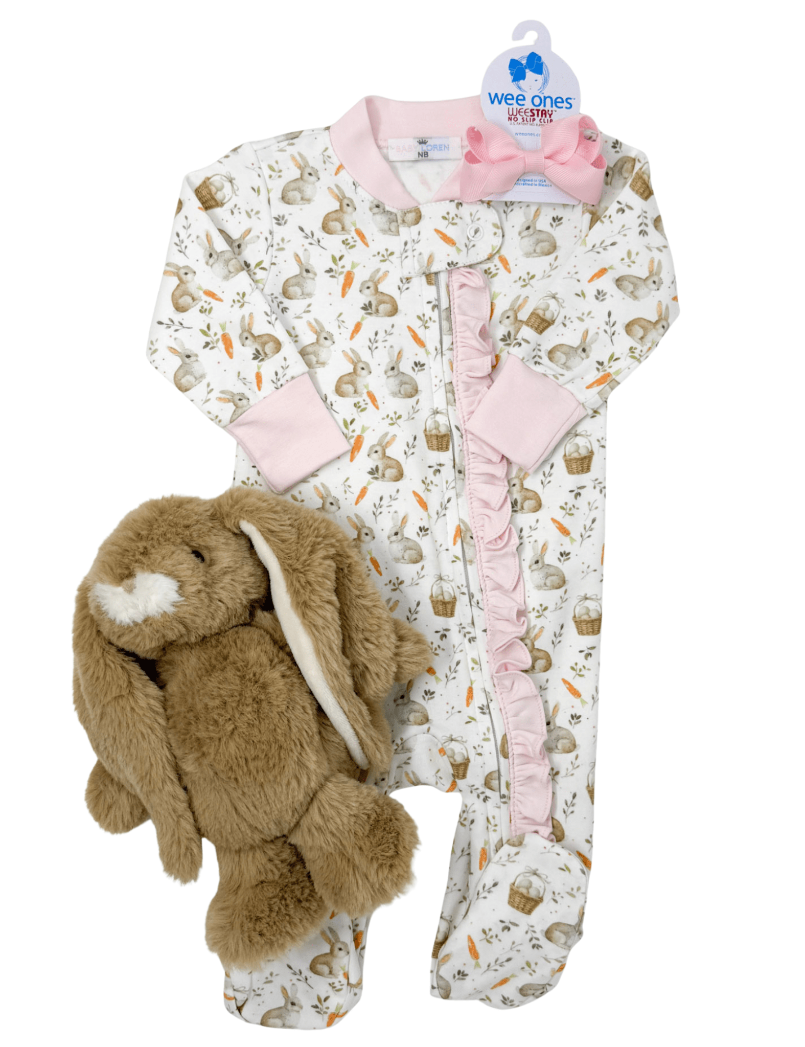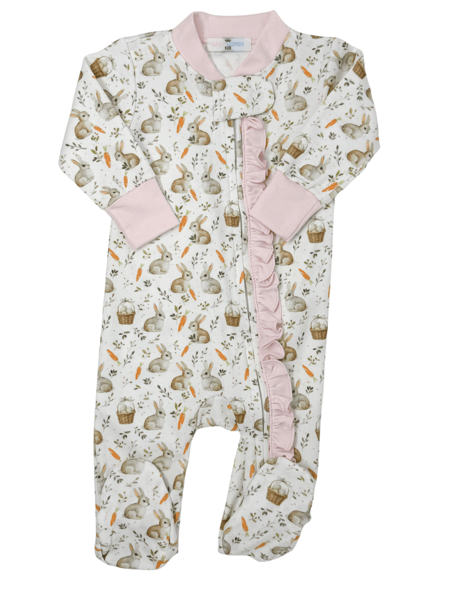 Leaping Bunnies Print Ruffle Zip Footie - Lt. Blue