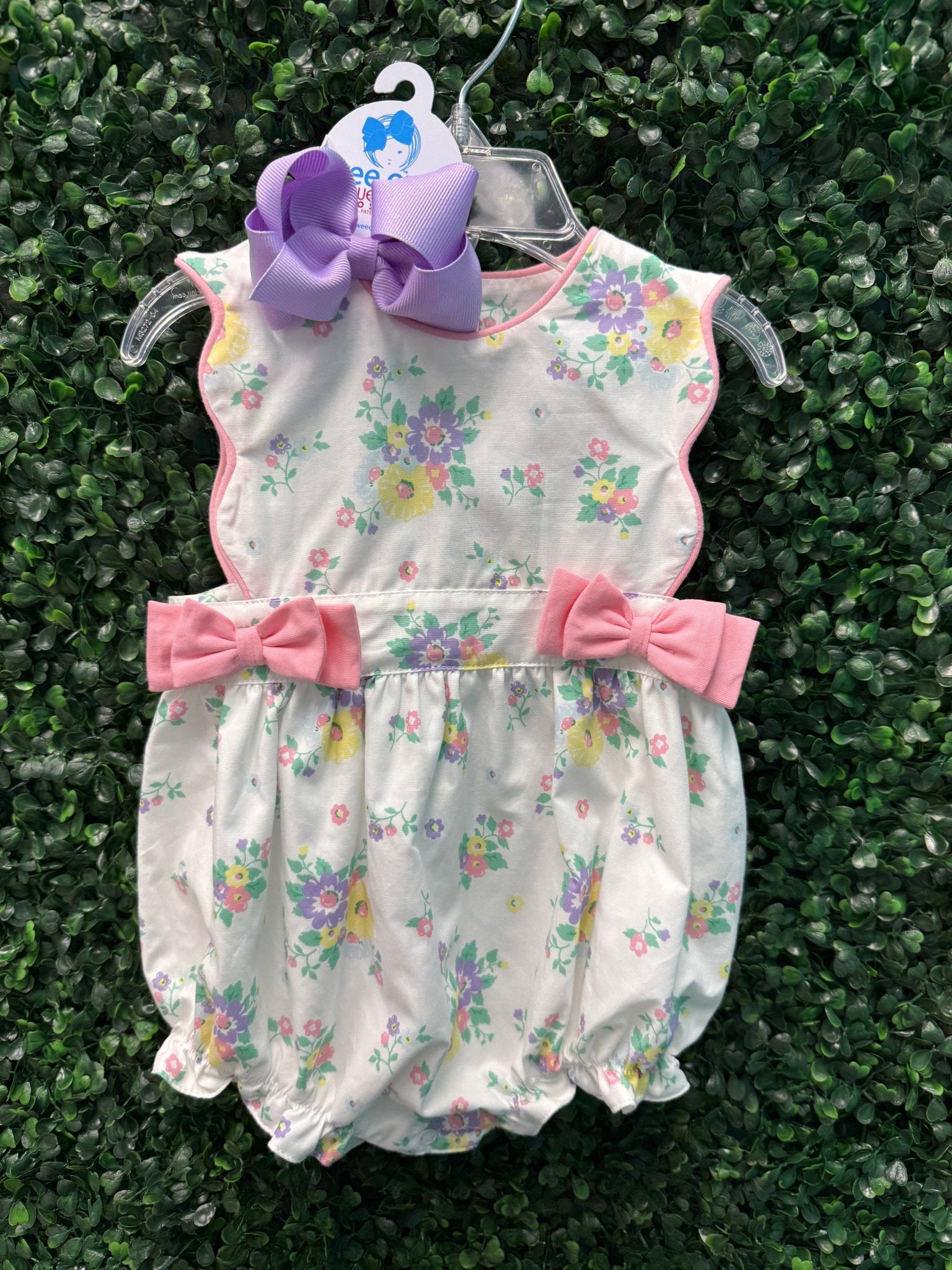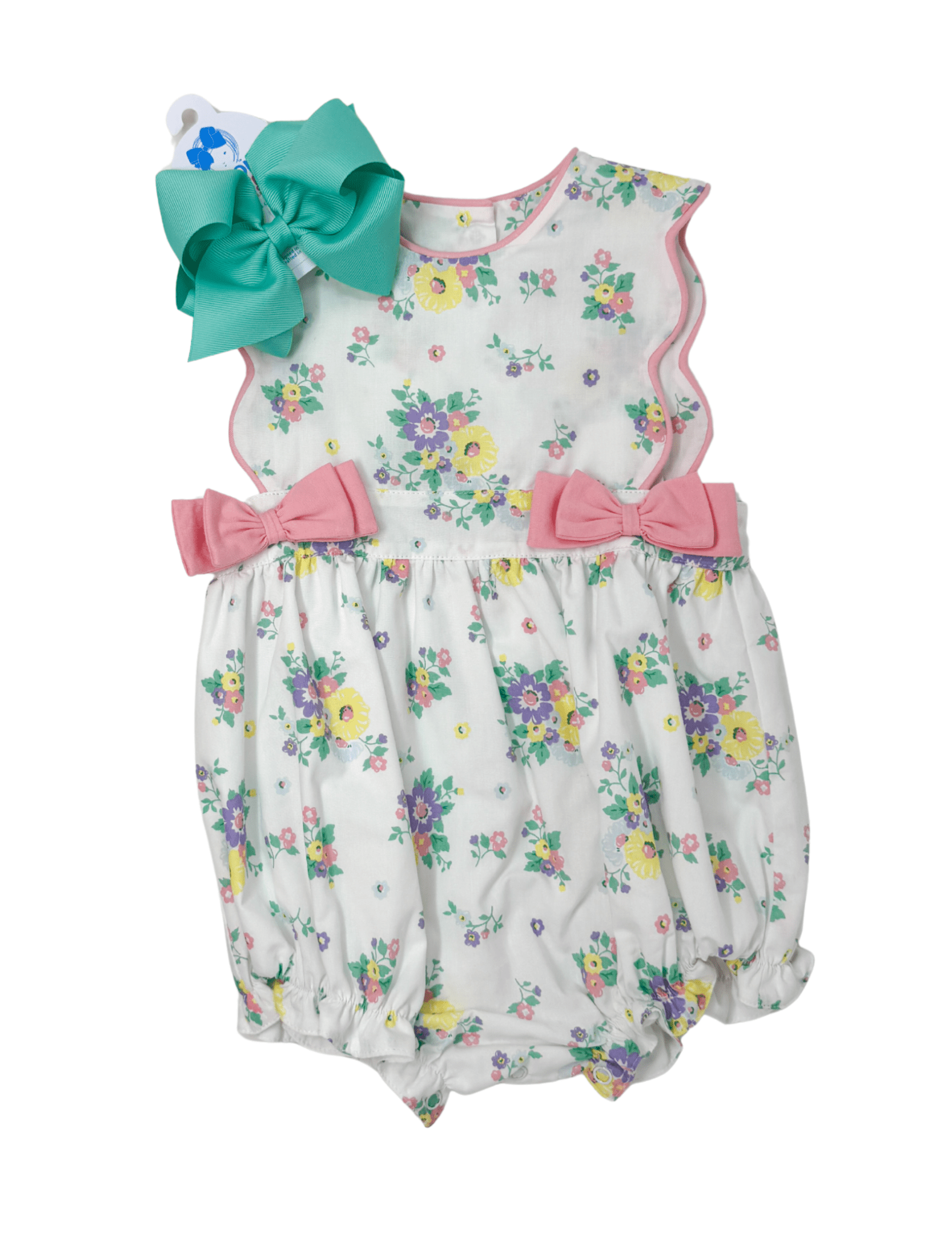 Sweet as a garden in bloom, the Hand Picked Bubble is full of delicate details that make baby moments feel extra special. With a crisp white background scattered in multicolored florals, this charming bubble is accented by pink scalloped piping and dainty bows at the waistline for a truly timeless look. Soft ruffles and elastic at the legs add comfort and cuteness, while thoughtful closures make dressing easy. Perfect for portraits, special outings, or simply soaking up sweet baby days, this piece is as lovely as it is memorable. A coordinating dress is available for the most darling matching moments.