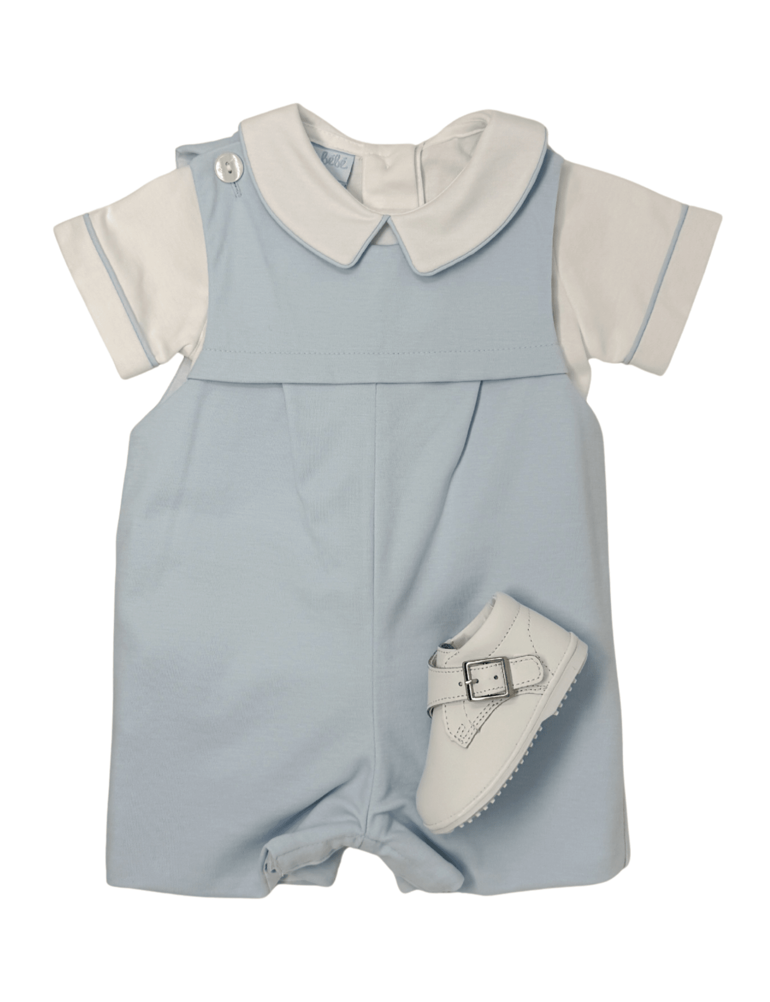 Classic and heirloom-inspired, the Boy’s Knit Jon Jon Set is a timeless choice for special occasions and milestone moments. This charming two-piece set features a crisp Peter Pan collar shirt accented with delicate light blue piping along the collar and sleeve hems. Layered over the shirt is a coordinating light blue knit jon jon with button-tab shoulders and snaps in the stride for easy changes. Thoughtfully designed in soft, breathable cotton, it’s perfect for church, milestone pictures, and treasured memories.