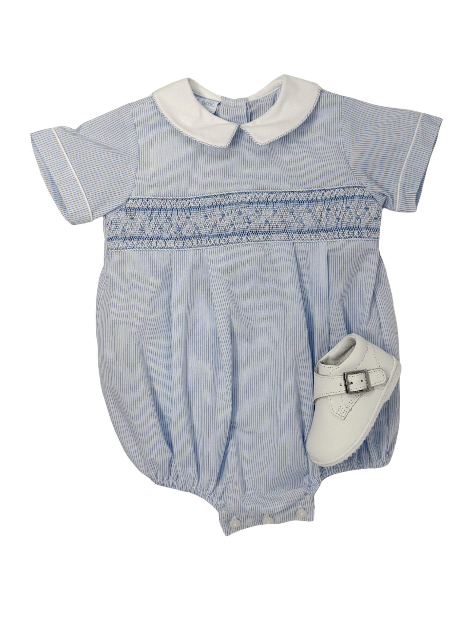 Timeless and sweet, the Ryan Boy’s Bubble is a classic heirloom-style piece for baby boys. Featuring delicate blue and white vertical stripes, this charming bubble is finished with hand smocking across the chest and a crisp white Peter Pan collar for a polished look. Traditional buttons at the back and in the stride add both functionality and vintage appeal, making it perfect for special occasions and heirloom-ready moments.