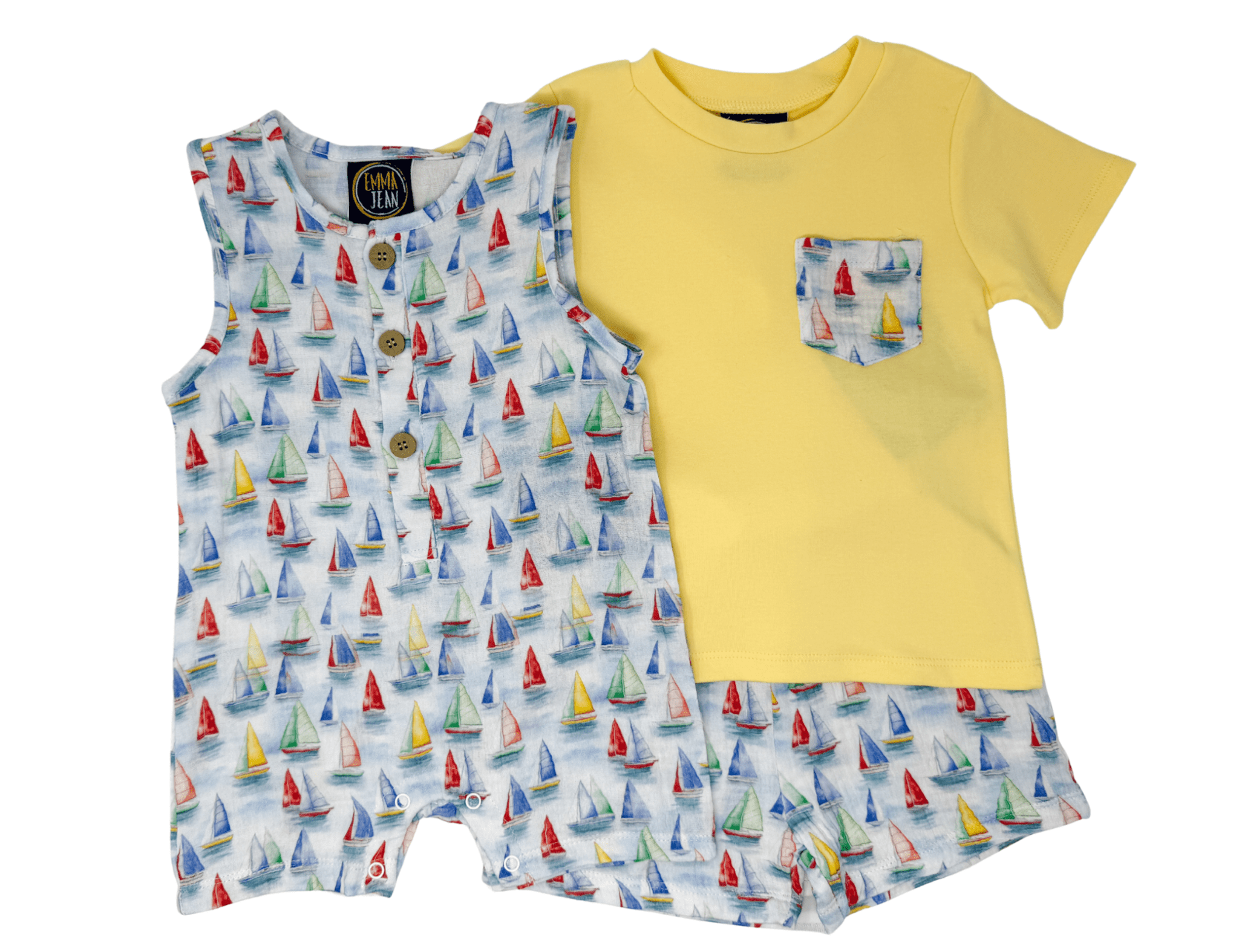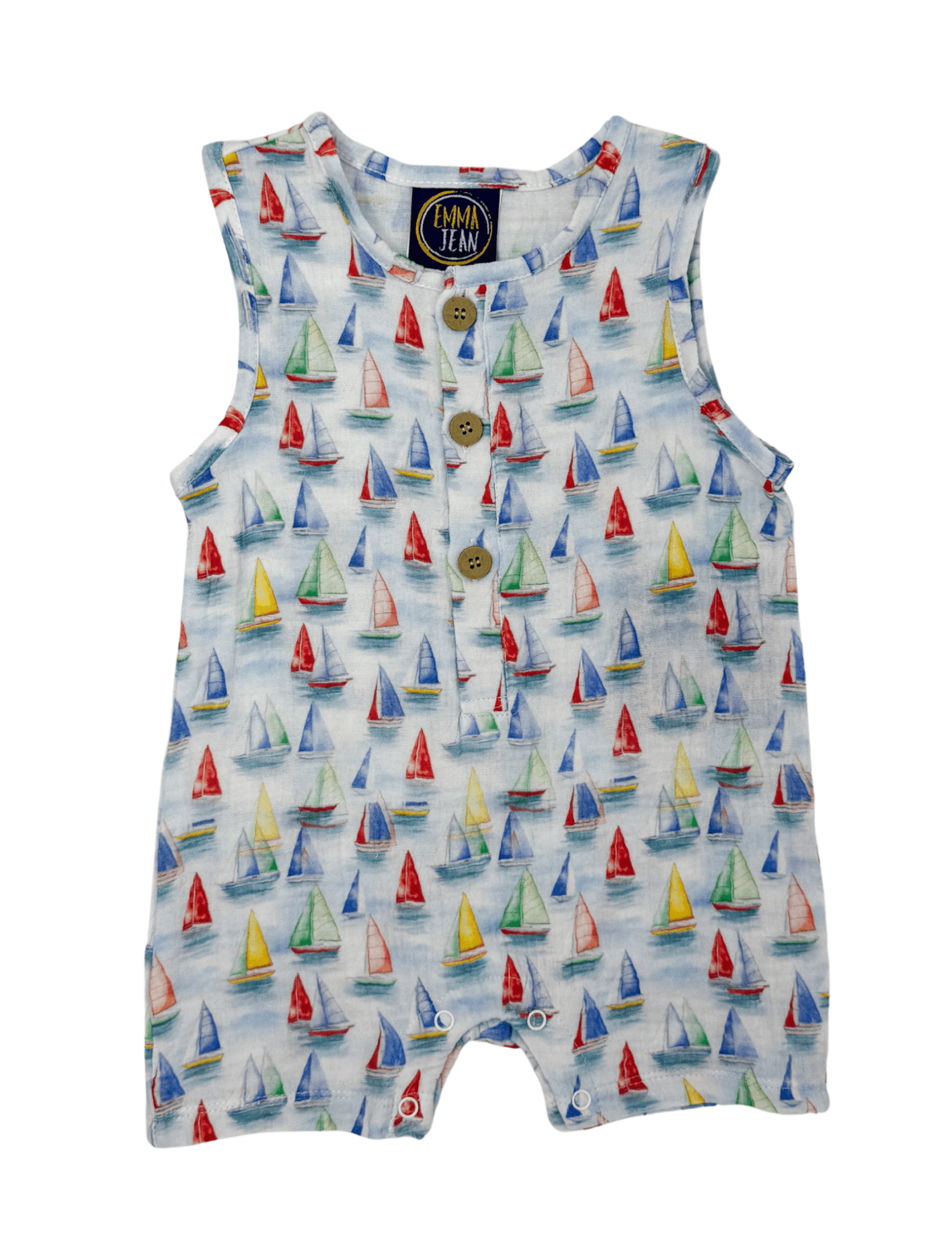 Set sail in the sweetest summer style with the Boys Sail Away Romper. Made from lightweight cotton muslin, this breezy one-piece is perfect for warm-weather adventures. The colorful sailboat print feels playful and classic, while the button front adds an extra polished touch. Easy, comfy, and ready for anything—this romper is a must for beach days, family trips, and everyday cuteness.