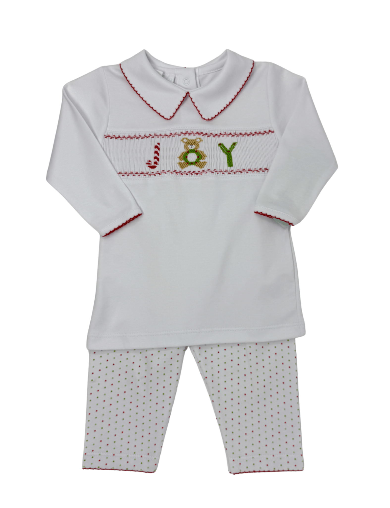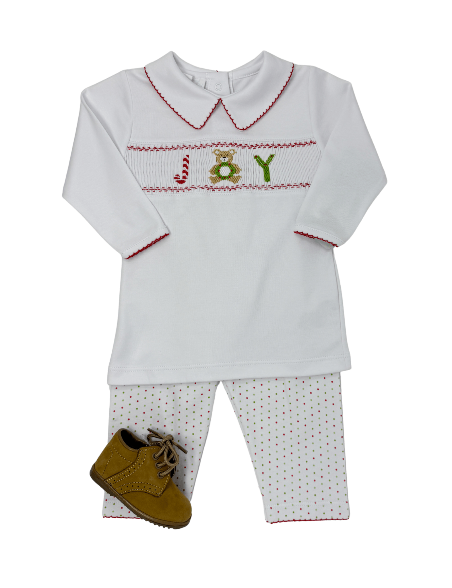 A timeless holiday look made for joyful moments. This smocked two-piece set features a classic white Peter Pan shirt with delicate moonstitch embroidery on the collar and a hand-smocked chest plate embroidered with the word “JOY.” Paired with white pants adorned in cheerful red and green micro polka dots, it’s the perfect outfit for festive celebrations and cozy family gatherings.