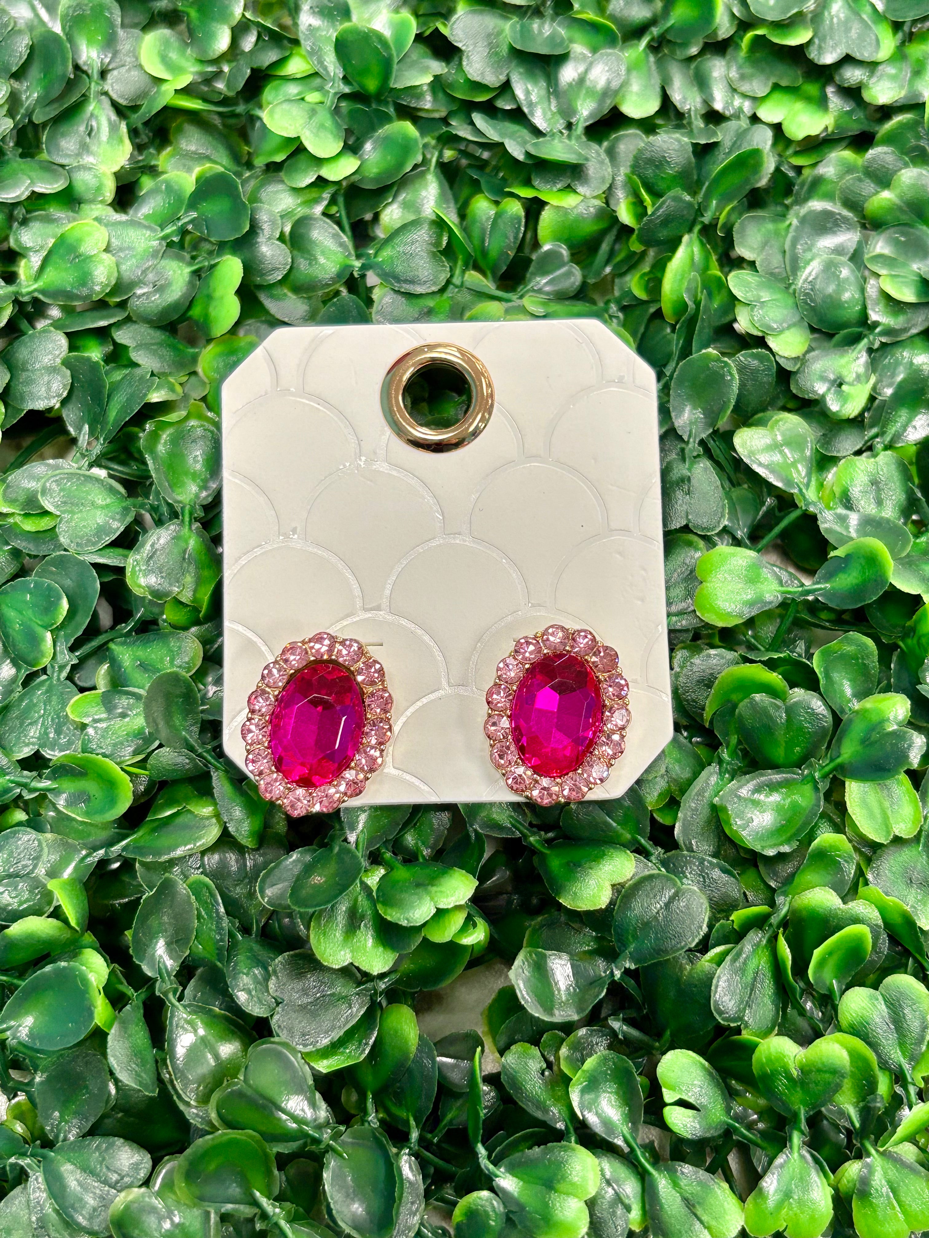 Paved Crystal Oval Earrings - Fuchsia/Hot Pink