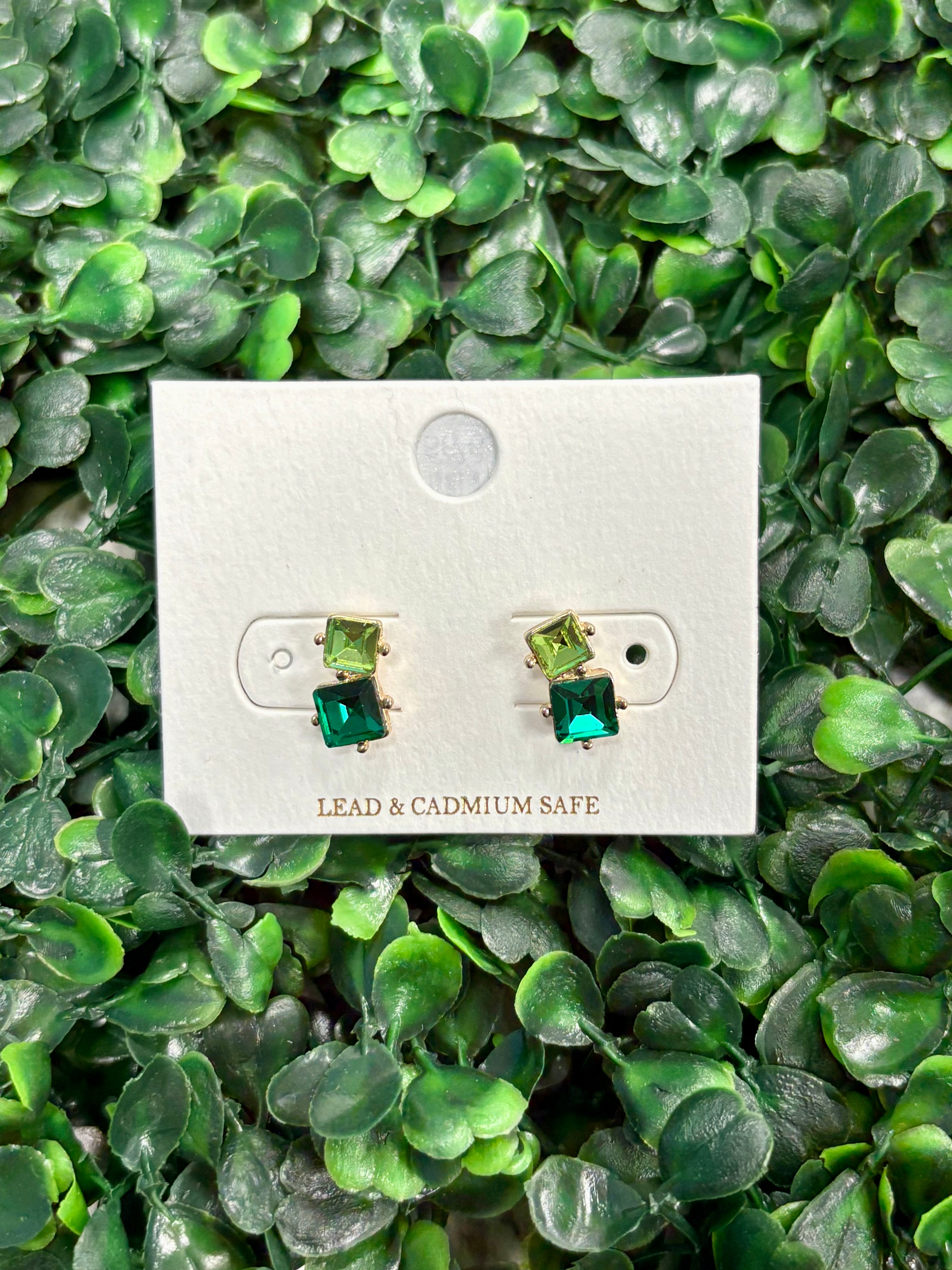 Double Square Crystal Earrings - Green/Lime