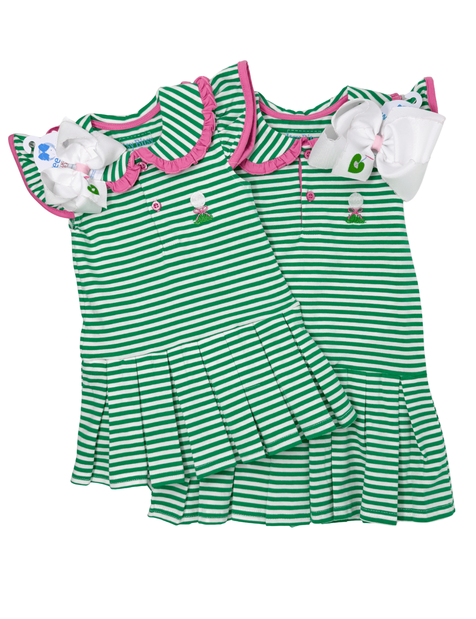 Sweet, sporty, and made for twirling, the Golf Skirted Bubble is is a total standout for little girls who love to look cute and feel comfy. The bright green stripes paired with pink trim give it a fun, preppy vibe, while the ruffle collar and flutter sleeves add extra charm. Finished with a playful golf detail on the chest and a pleated skirt, this dress is perfect for playdates, parties, and picture-perfect days.