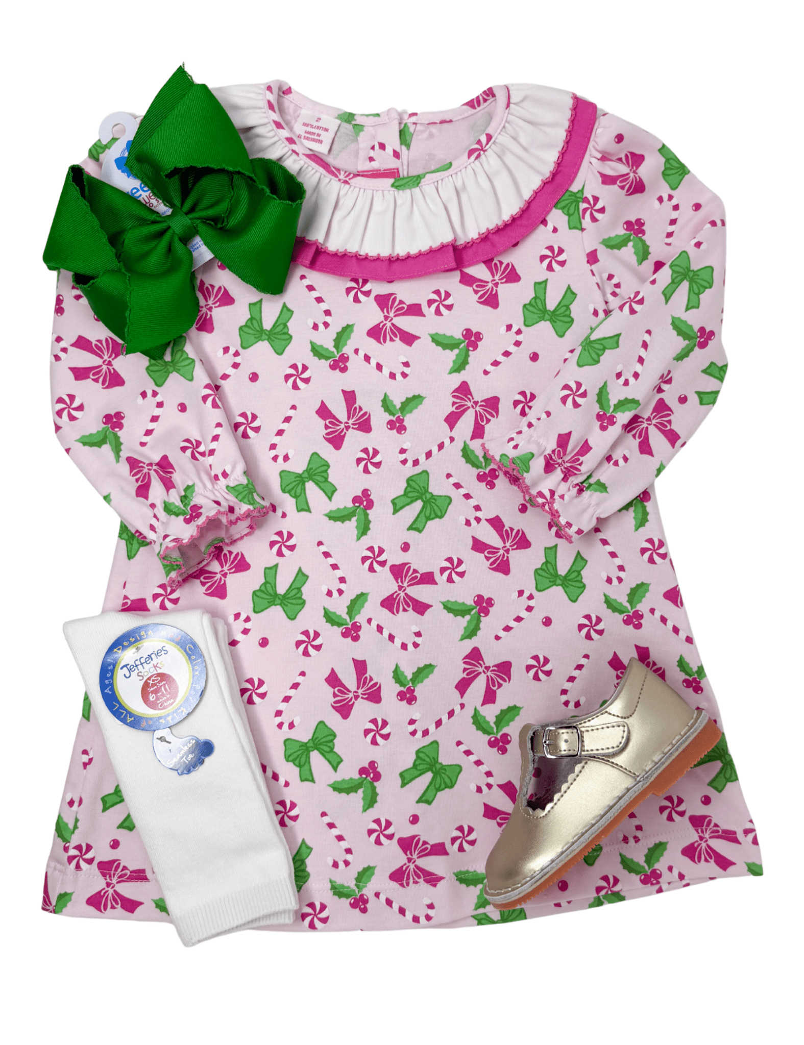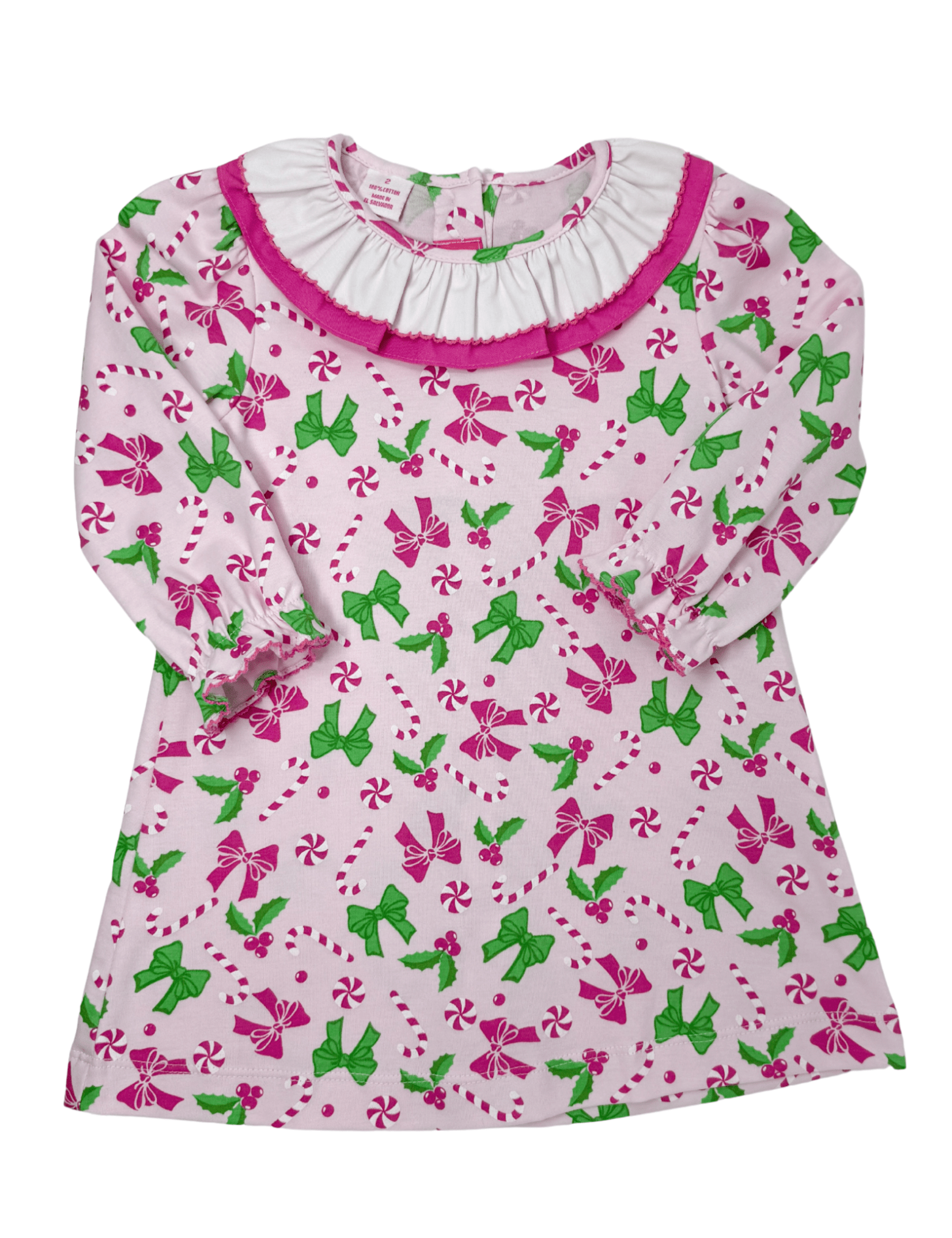 Sweet as the season itself, the Candy A-Line Dress is a holiday delight in light pink with playful pink and green peppermint, candy cane, and bow prints. A charming two-tone ruffle collar and full button back add timeless touches to this cheerful style. Pair it with the coordinating full-length romper for a perfectly festive sibling look.