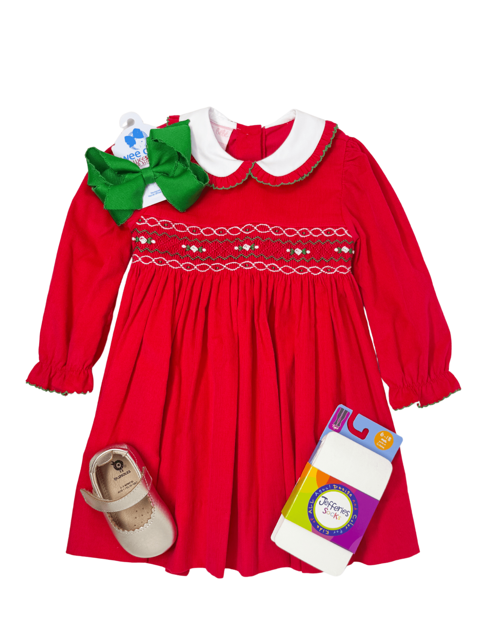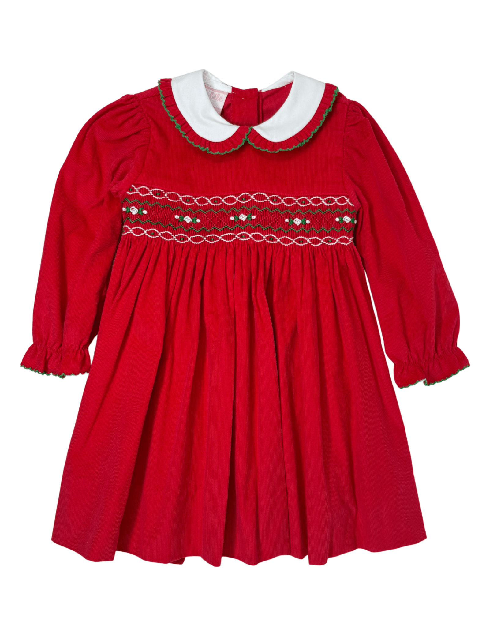A timeless holiday classic designed for cherished moments and picture-perfect memories. The Rachel Dress features soft red corduroy with elegant smocking across the chest, delicately embroidered in white and green. Finished with a crisp white Peter Pan collar, long sleeves, and a button-back tie sash, it’s the perfect choice for festive occasions. Pair it with the coordinating boy romper for a matching sibling look.