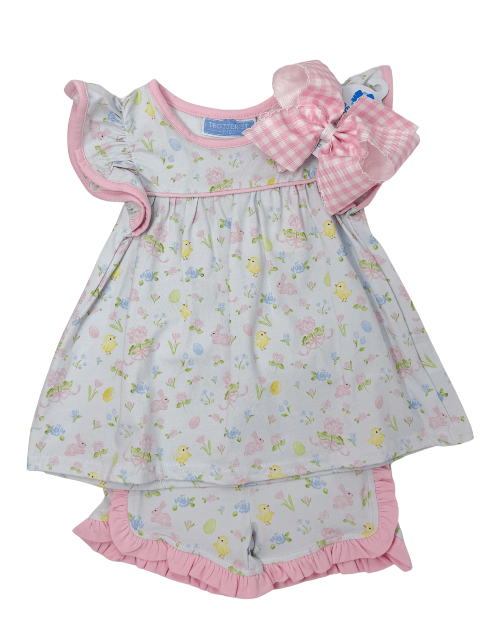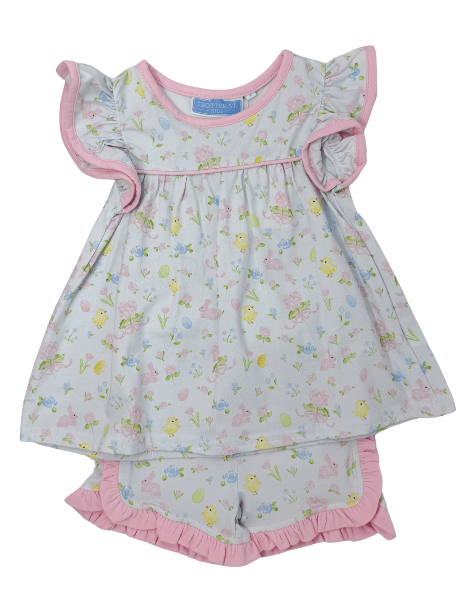 Sweet as springtime and made for little adventures, the Cottontail Ruffle Play Set is full of charming details and everyday comfort. Featuring a soft pastel bunny-and-chick print, fluttery ruffle sleeves, and coordinating ruffle-trim shorts, this darling two-piece set is perfect for playdates, holidays, and warm sunny days. Finished with contrast pink trim and an oversized bow for extra sweetness, it’s a look that feels playful yet timeless.