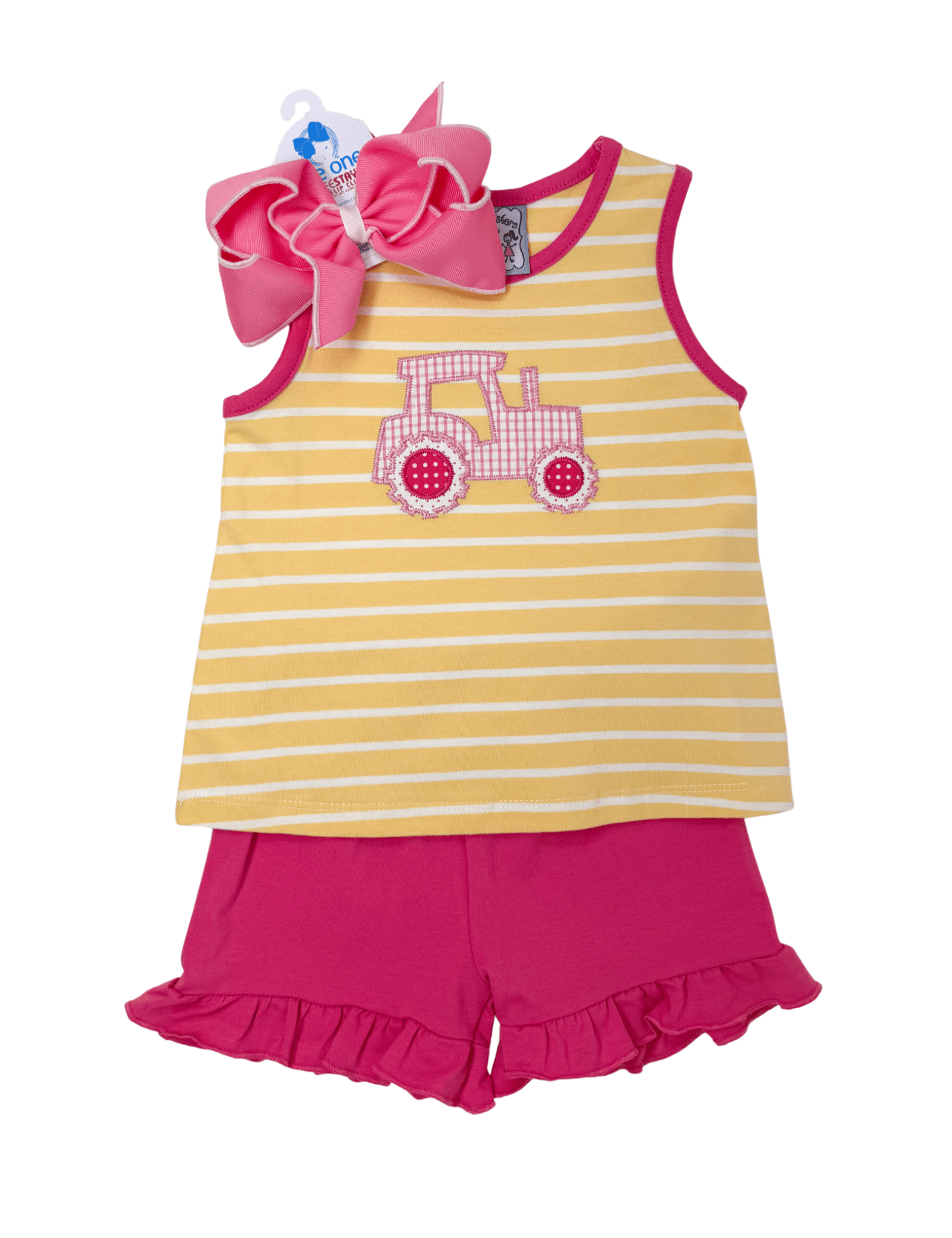 Fun, bright, and full of personality, the Girls Tractor Short Set is perfect for little ones who love playful style. The yellow and white striped top features bold hot pink piping along the hems and a sweet pink tractor appliqué on the front for a pop of charm. Coordinating hot pink ruffle shorts complete the look with an easy pull-on elastic waistband, making this set as comfortable as it is cute.