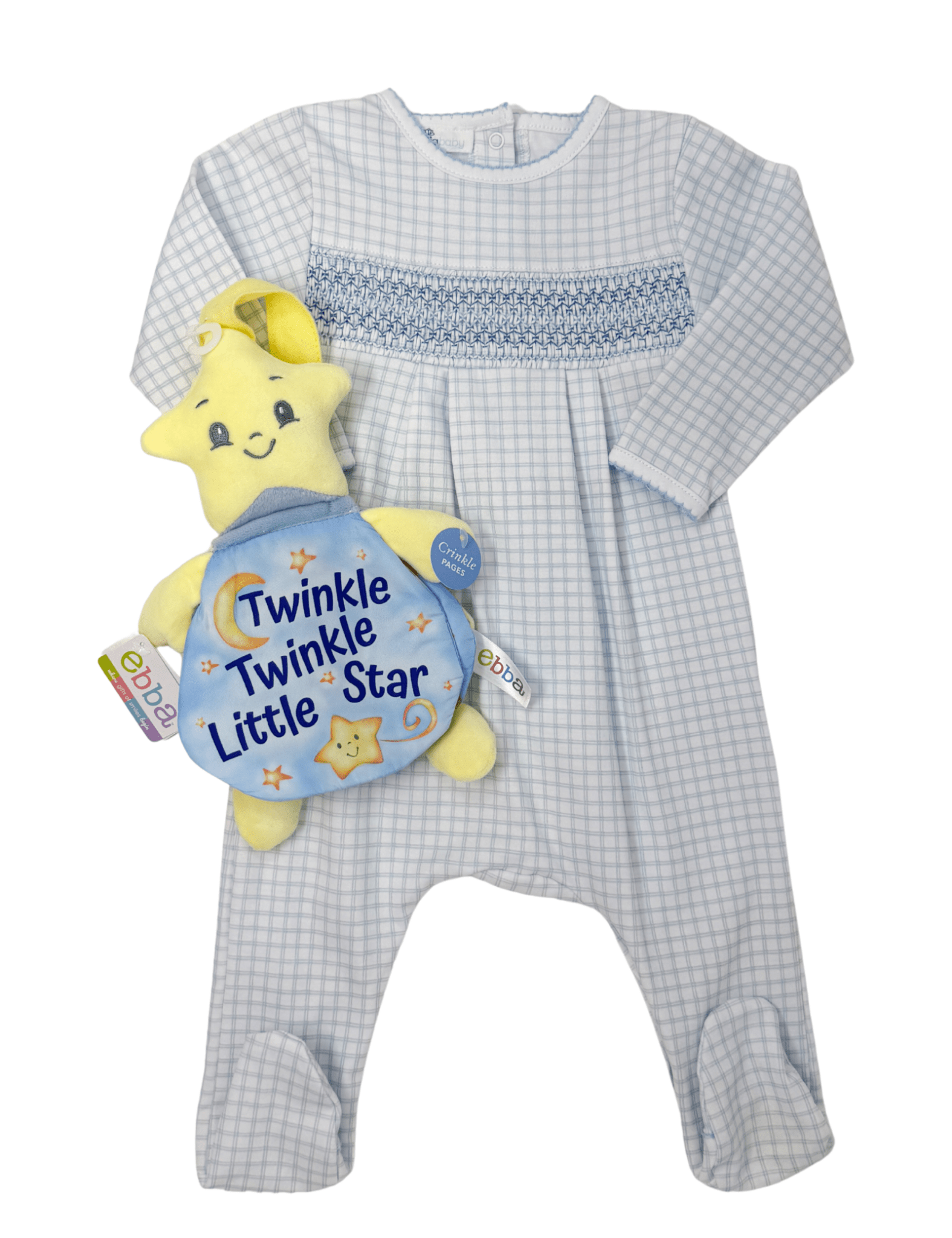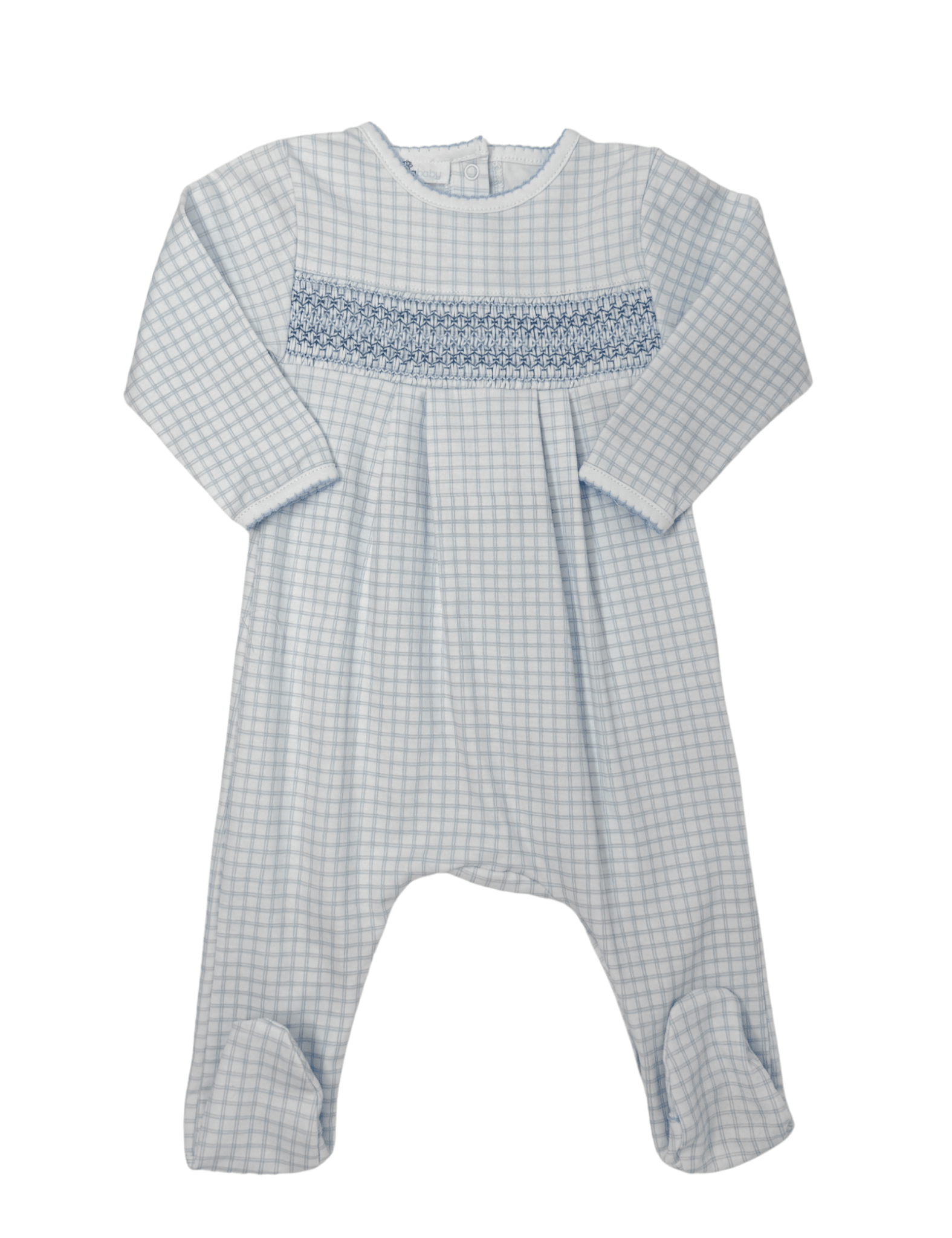 Presenting a cherished footie with our Peek-A-Boo Wishes Smocked Footie in light blue, crafted from the most luxurious Pima cotton. This adorable footie features charming hand-smocked detail, delicate light blue picot trim, and a sweet check pattern, perfect for spending quality time with family, visiting loved ones, a delightful first adventure at the park.