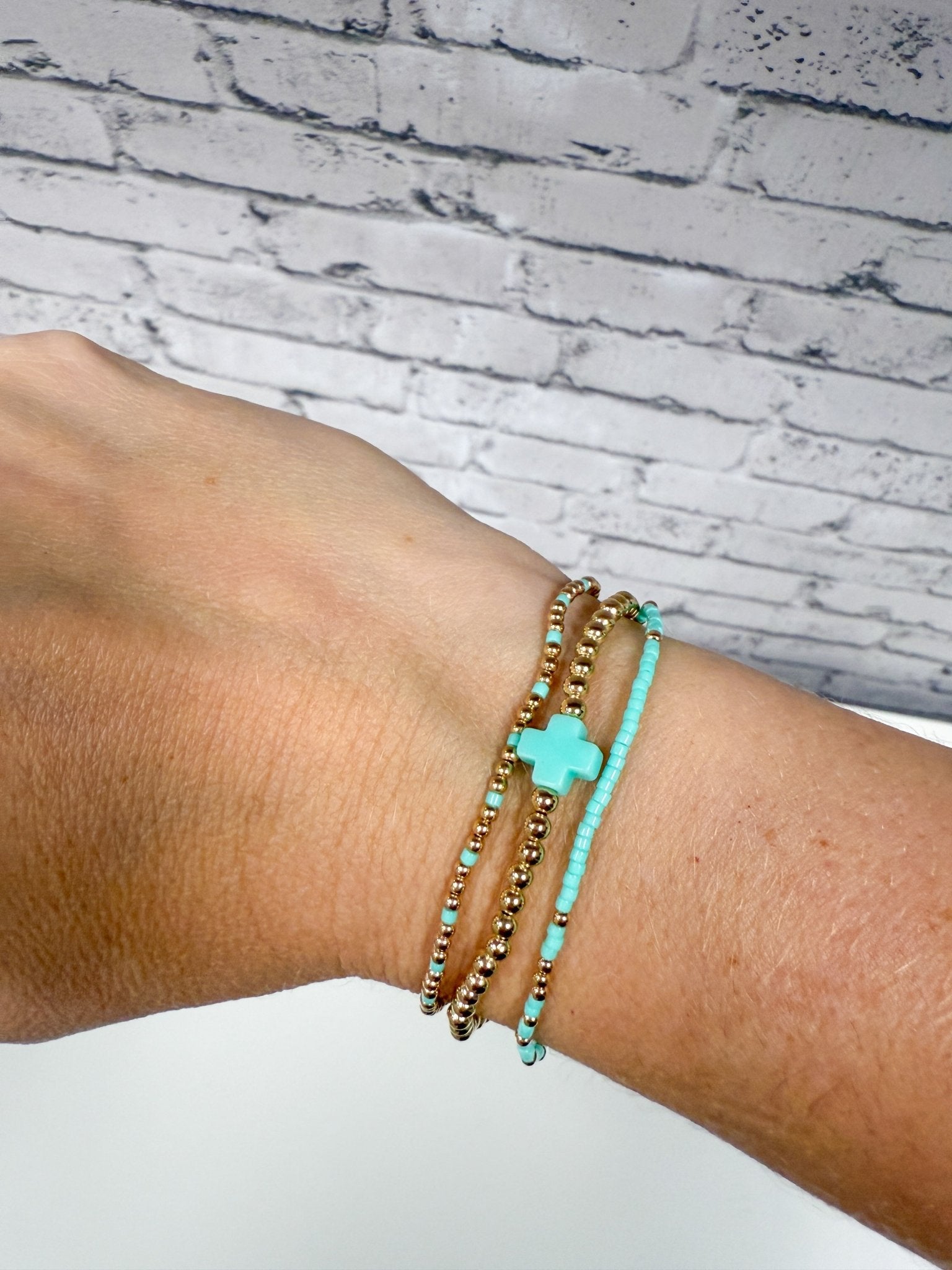 ✨ Includes: a Hope Unwritten Bracelet - Mint, Hope Sincerity Pattern 2mm Bead Bracelet - Mint and Signature Cross Gold Pattern 3mm Bead Bracelet - Mint