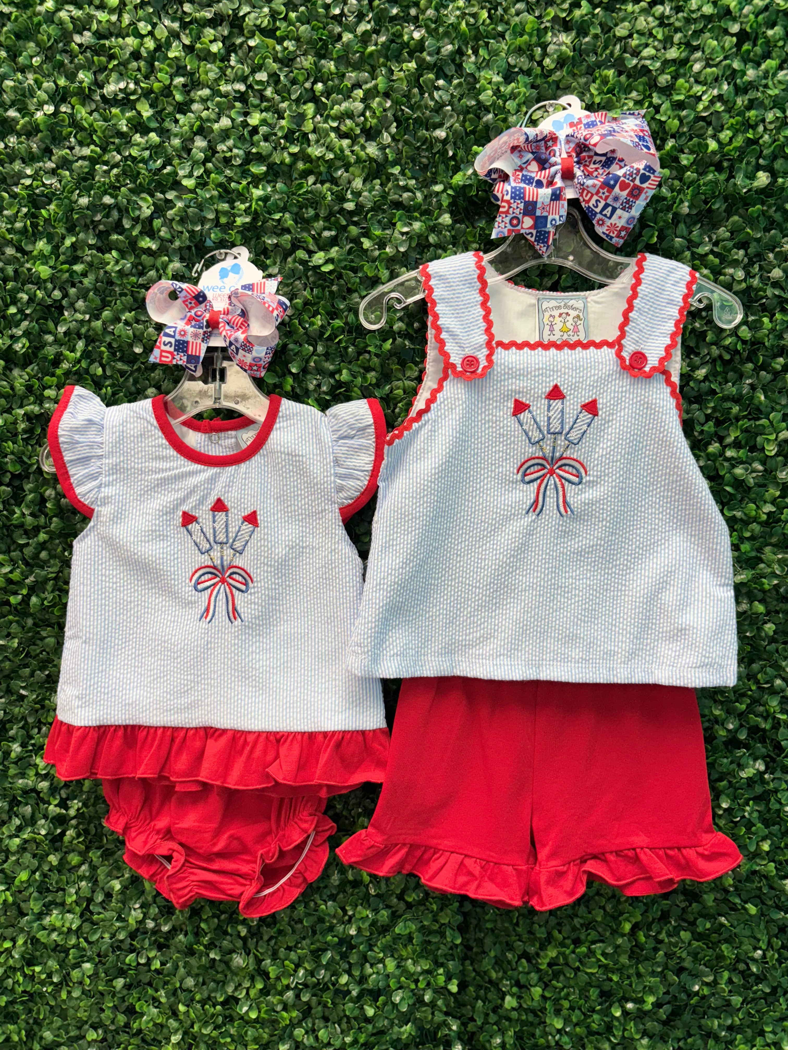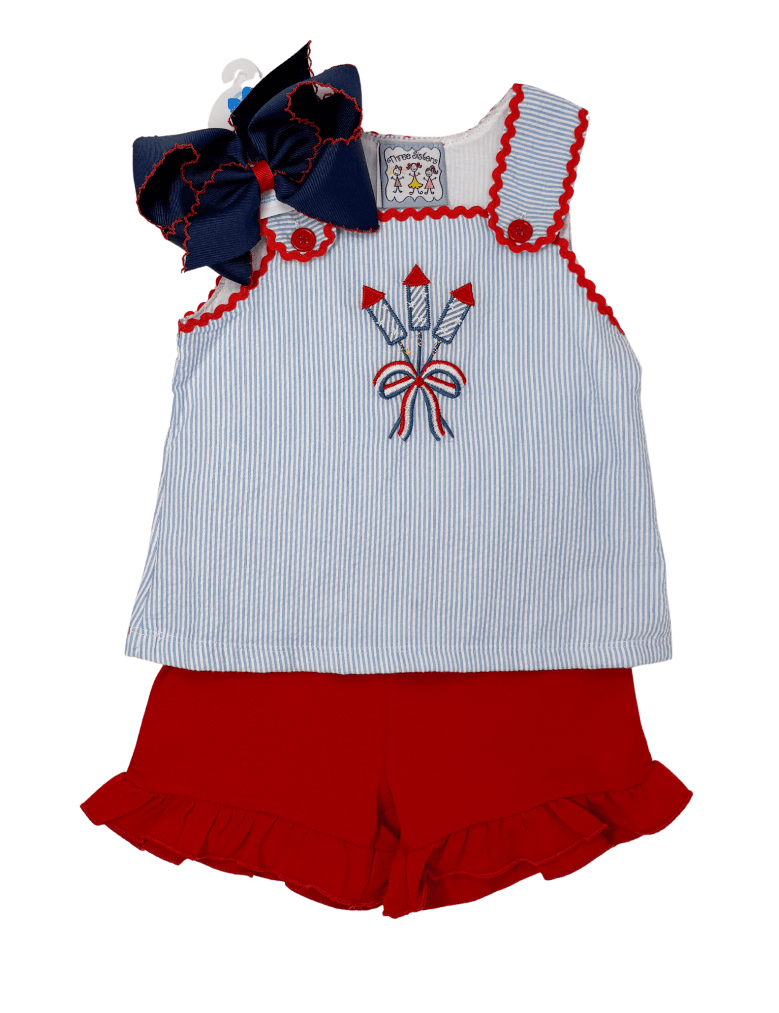 Bright, festive, and full of summer charm, the Girls Fireworks Short Set is perfect for patriotic celebrations and warm-weather fun. The sleeveless blue-and-white seersucker top features sweet button-tab shoulders, bold red ric rac trim, and cheerful fireworks with bow embroidery on the front. Fully lined for comfort, it pairs beautifully with coordinating red ruffle shorts designed with an easy pull-on elastic waistband.