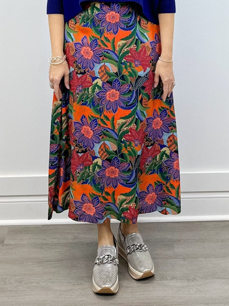 Turn heads with the Tiffany Skirt, a bold statement piece designed to capture the beauty of the season. Crafted from sustainable 100% Ecovero viscose, it features a vibrant botanical print in warm autumn tones of orange, deep green, and berry. The flattering maxi silhouette drapes effortlessly, creating a flowy, feminine movement with every step. A comfortable waistband adds ease to its elegant style, making it perfect for dressing up or down. Pair it with cozy knits or sleek blouses for a polished look that transitions seamlessly from day to night.
