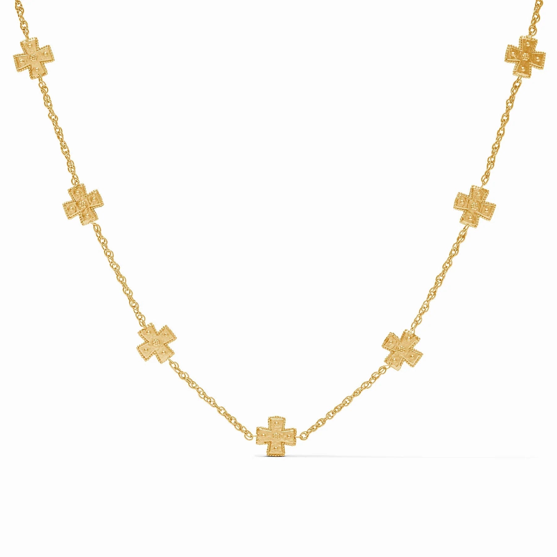 Elevate your everyday elegance with this Canterbury Delicate Station Necklace, where timeless craftsmanship meets subtle shine. Each hand-hammered cross is adorned with tiny golden beads, creating a beautifully textured finish that feels both meaningful and modern. Suspended along a delicate rope-style gold chain, these intricate stations catch the light with every movement—perfect for layering or wearing as a refined standalone piece.