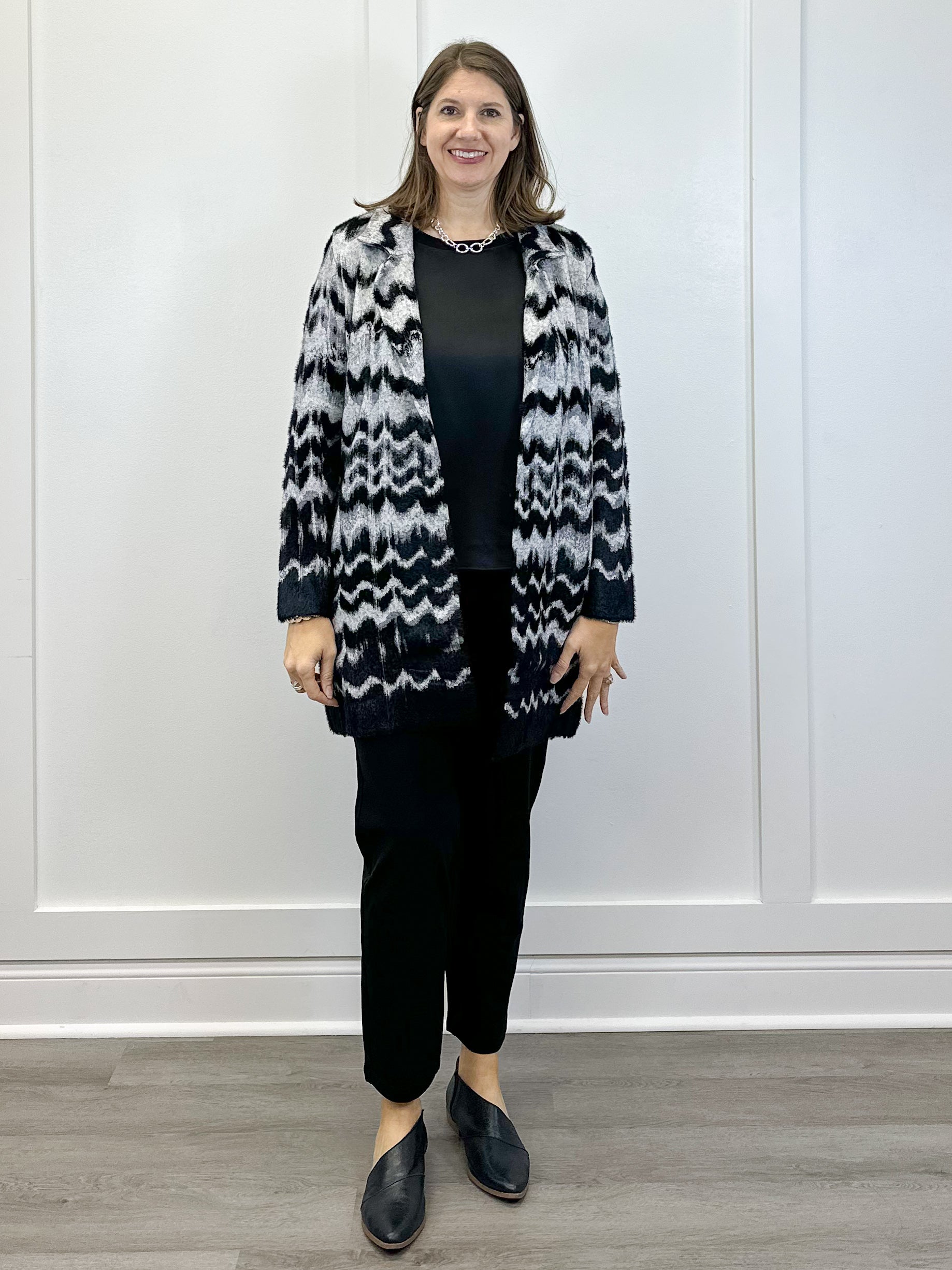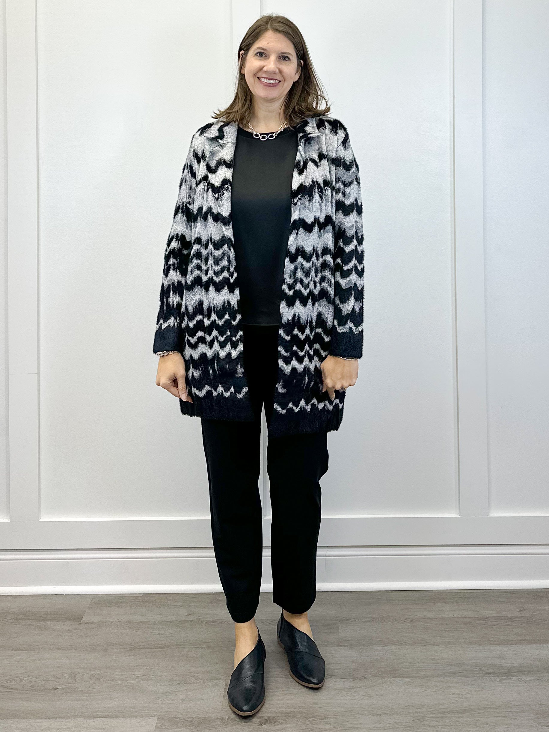 L/S Open Front Sweater Coat - Black/Gray Wavy Stripe