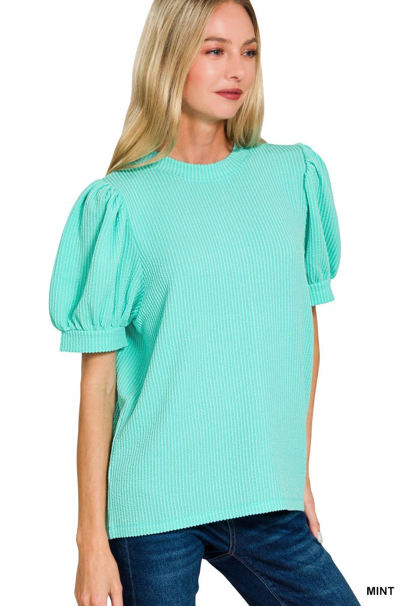 Soft, flattering, and effortlessly wearable, this textured puff sleeve top brings a touch of polish to your everyday look. Designed with a relaxed silhouette and subtle stretch, it drapes beautifully while keeping you comfortable from morning errands to casual evenings out. The gentle structure and feminine sleeves make it an easy favorite you’ll reach for again and again.