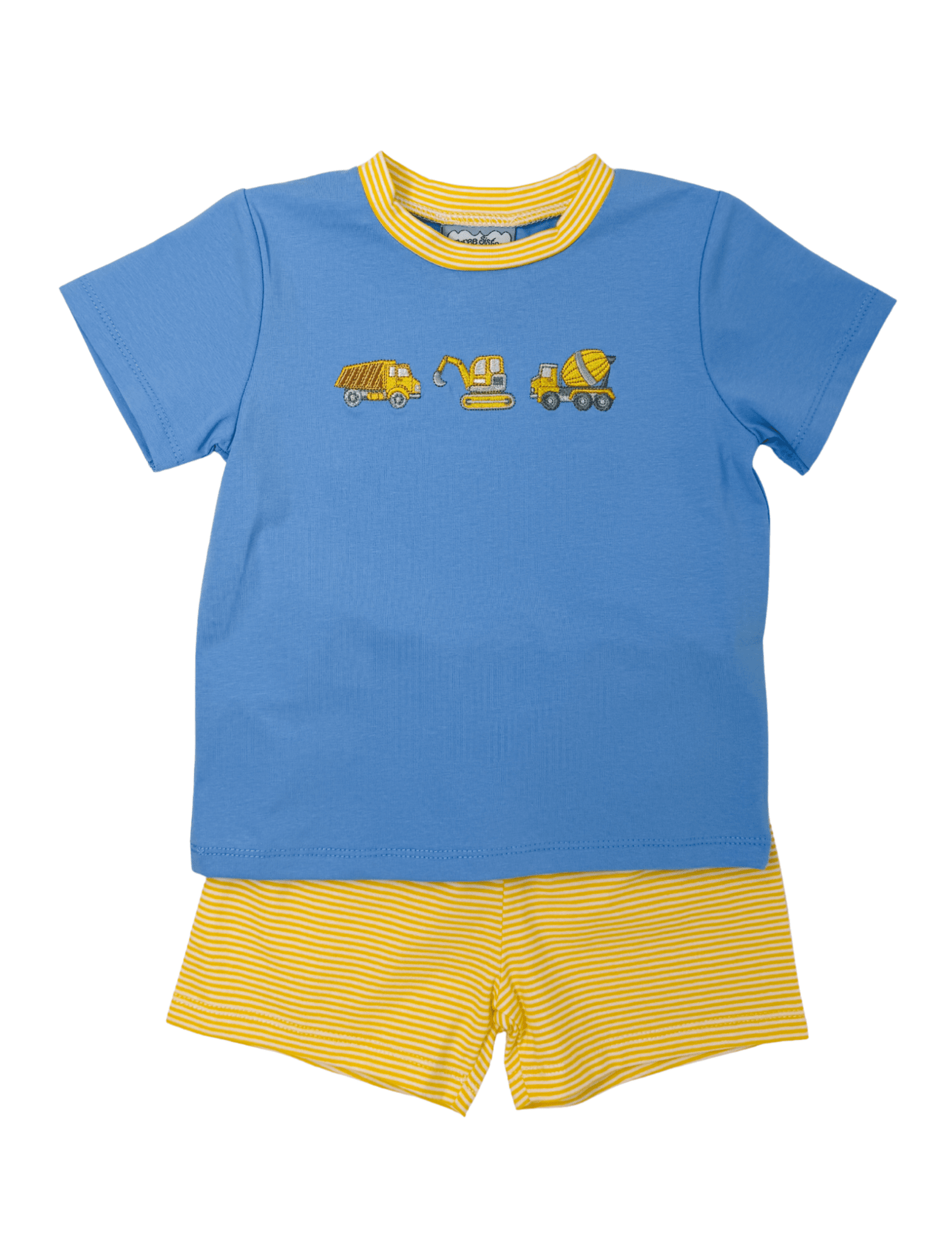 Perfect for little builders on the go, the Boys Construction Short Set is a fun and comfortable two-piece outfit made for everyday play. The soft blue shirt features a yellow striped collar and embroidered construction vehicles across the chest for a playful touch. Coordinating yellow striped shorts complete the look with an easy pull-on elastic waistband for all-day comfort.