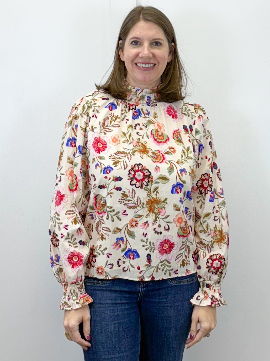 Romantic, airy, and effortlessly charming, this floral ruffled mock neck top brings a soft elegance to your everyday style. The exclusive &merci print blooms with vintage-inspired beauty, while the smocked mock neckline and ruffled details add a touch of whimsy. Billowy puff sleeves and a relaxed silhouette create graceful movement, making this top feel just as lovely as it looks—perfect for dressing up denim or pairing with tailored trousers for a polished finish.