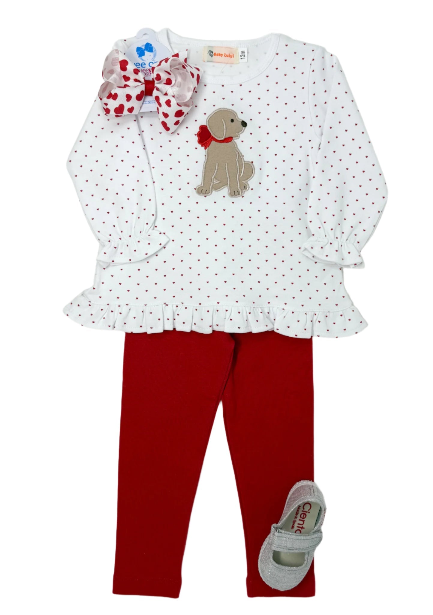 Create a sweet Valentine's Day look for your little girl with our Girls Ruffle Swing Top! Made from soft cotton, this long sleeve top features ruffle edge detailing and a heart polka dot design. Complete with an adorable puppy applique, it's the perfect addition to your little one's wardrobe. So sweet and stylish!