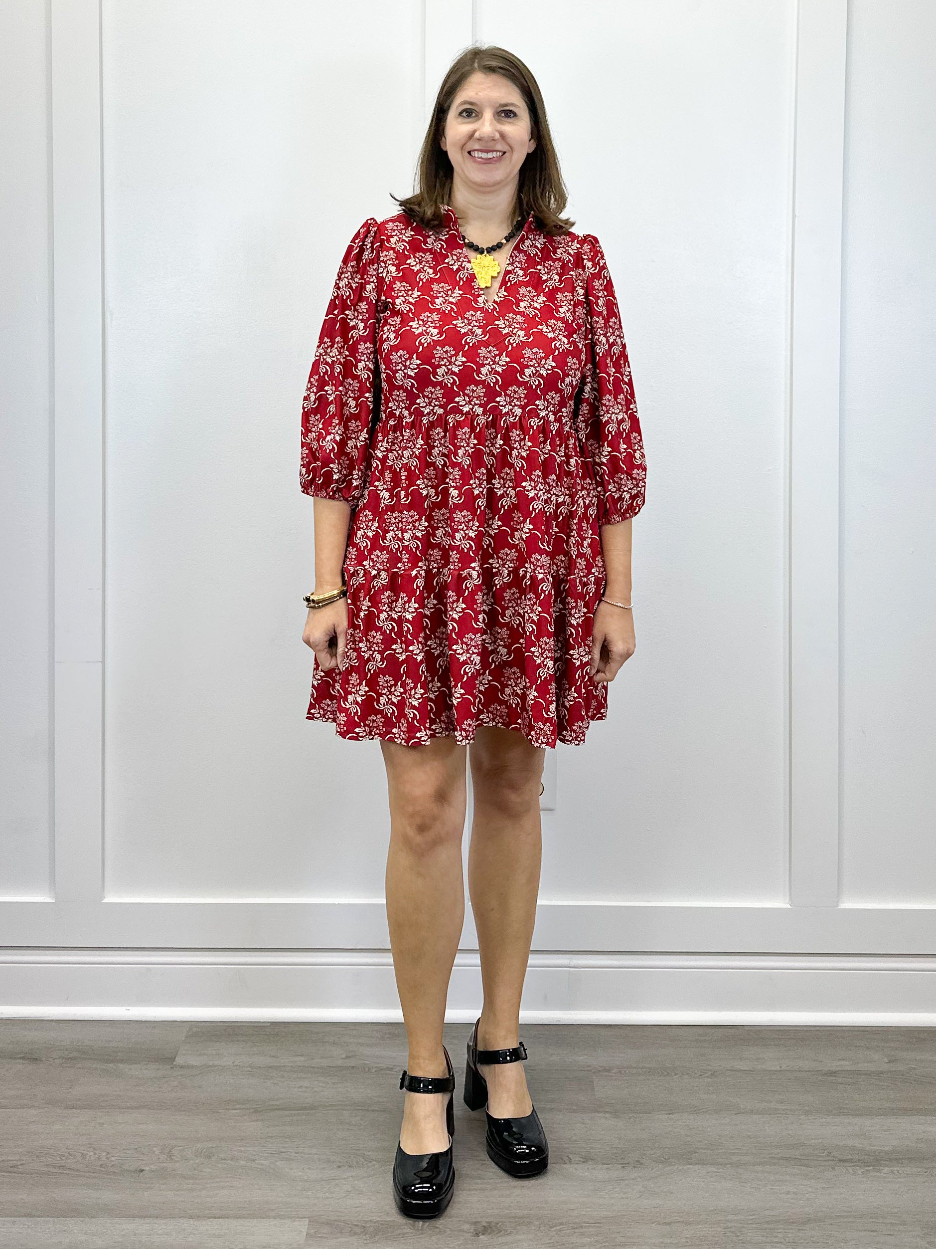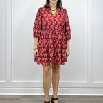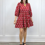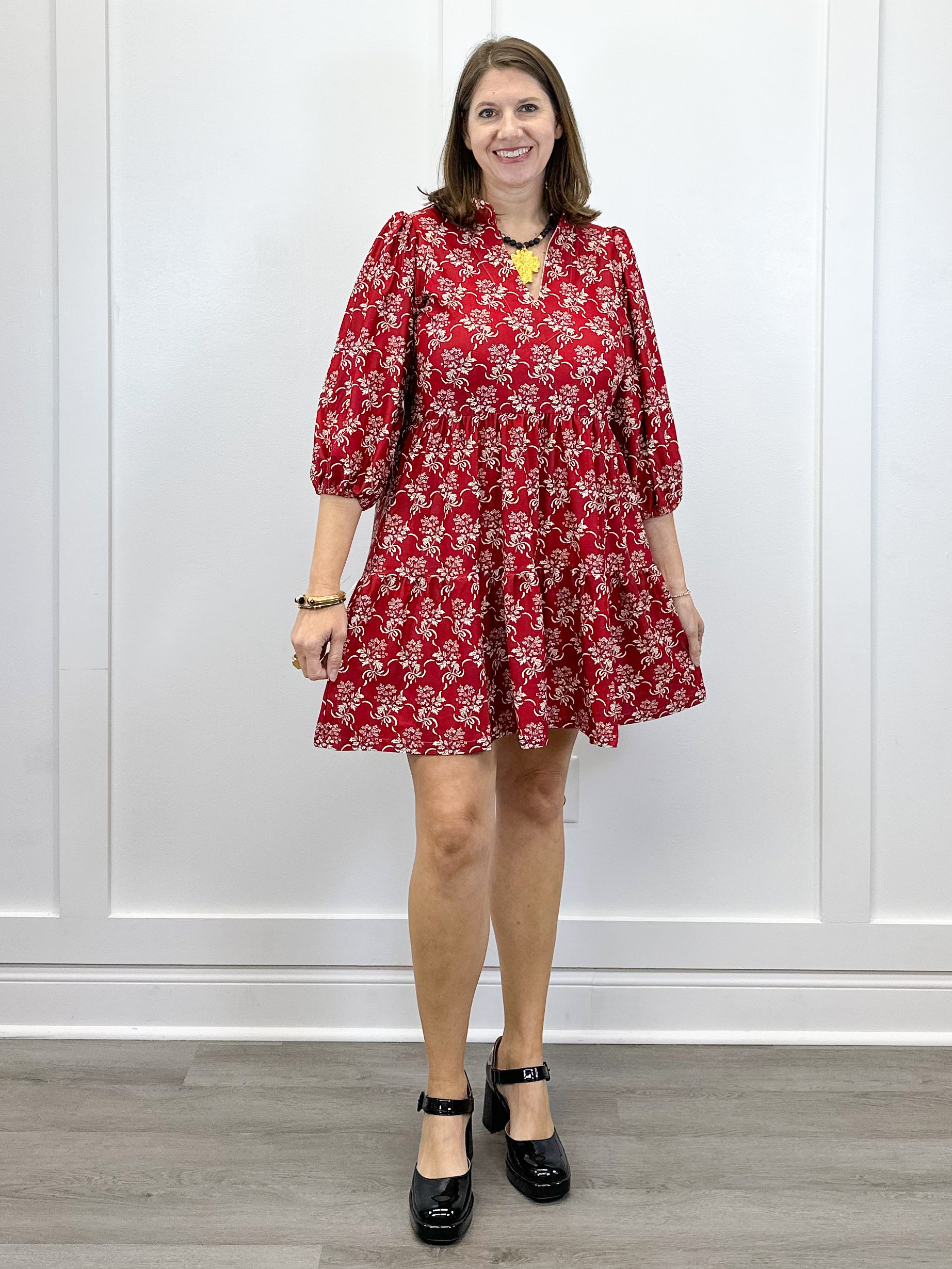 Fit: Relaxed tunic mini silhouette with tiered skirt and 3/4 puff sleeves for a feminine finish