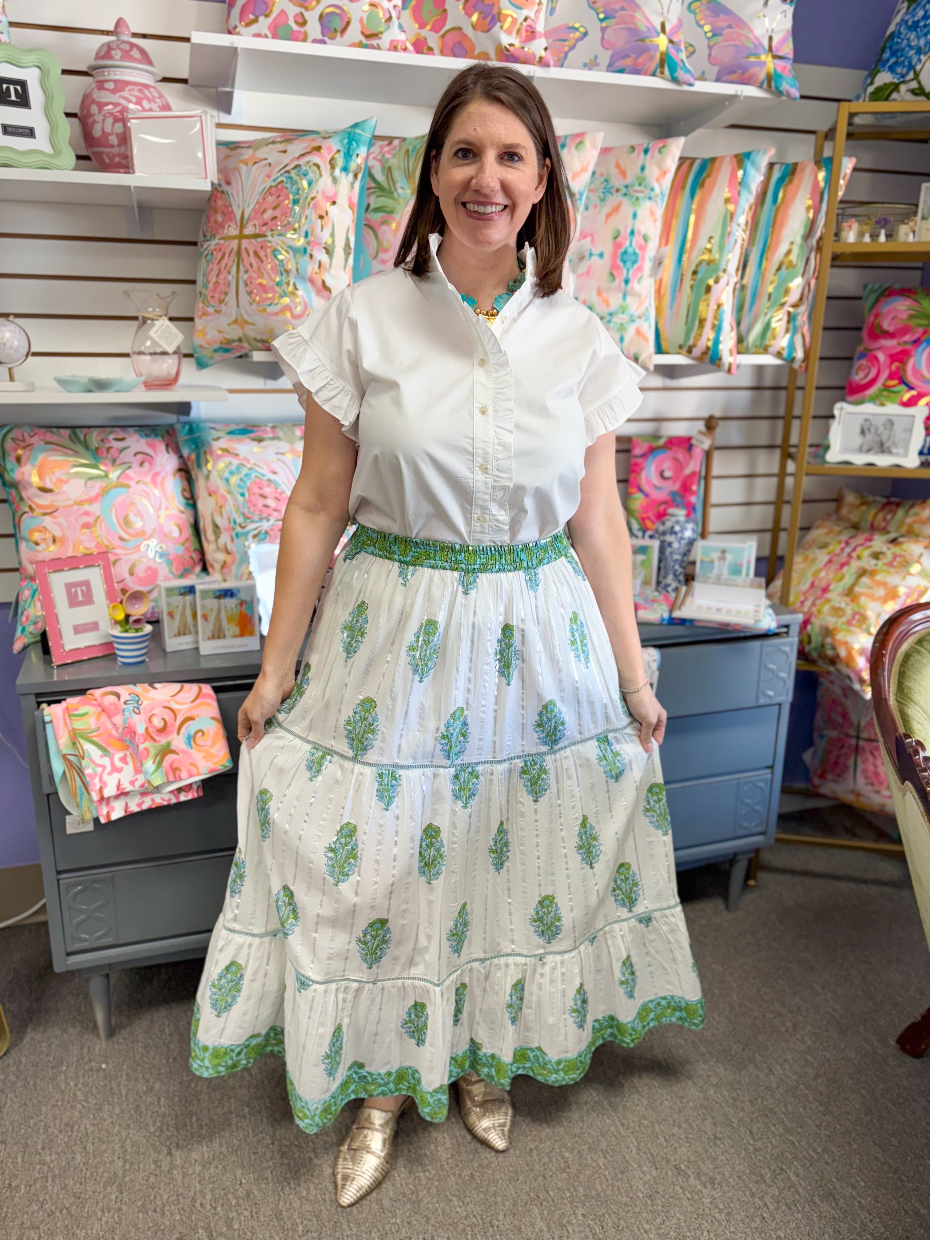Clean, classic, and effortlessly feminine, the Whitecap Ruffle Blouse is the perfect polished piece for everyday wear. Featuring a relaxed drop-shoulder fit with delicate ruffle detailing along the button front and collar, this crisp cotton top brings an elevated touch to any outfit—whether paired with denim, shorts, or dressed up for brunch.